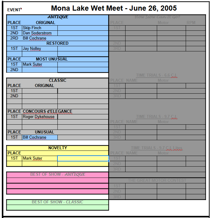 Our premier meet at the Mona Lake Boat Club in Norton Shores - hosted by Donna and Jack Gilbert occurred on Saturday June 26th, 2005.
