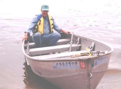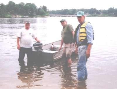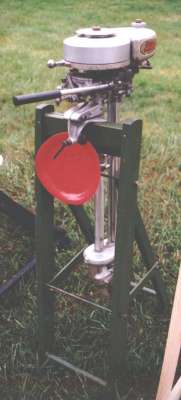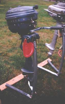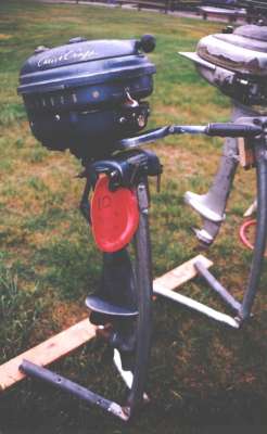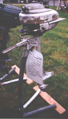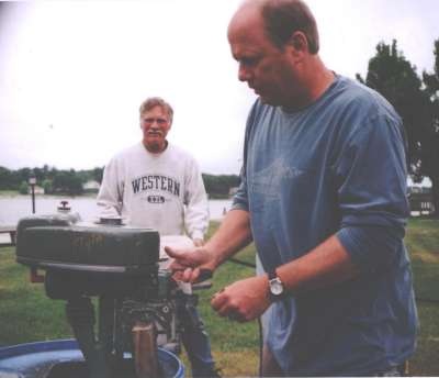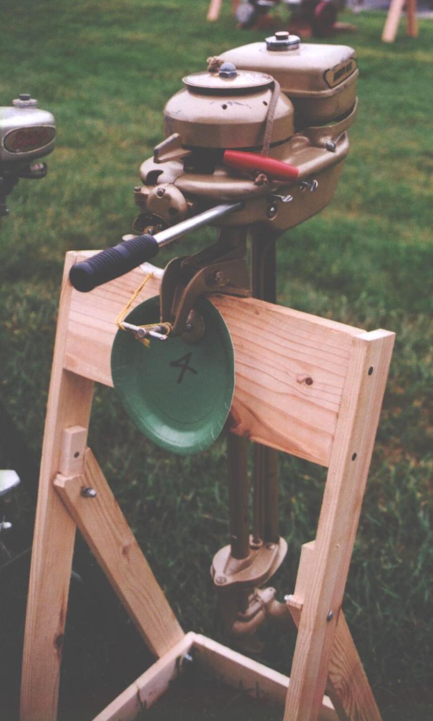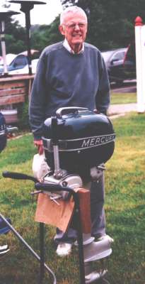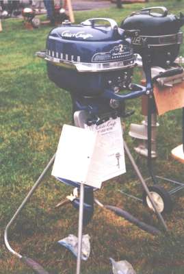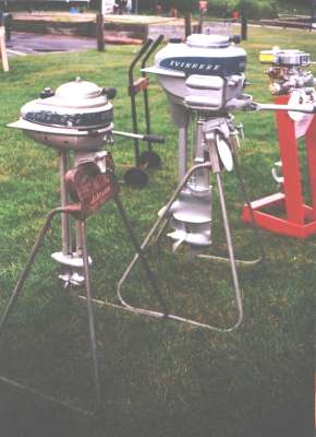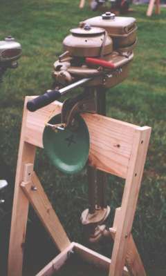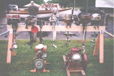 | This year's Mona Lake Wet meet was a big success and featured some timed "races" as well as a nice bunch of motors and boats on display, including an antique car! There was a swap meet area and there was the raffle for the 1949 KF-5 Mercury outboard. We had 23 registered attendees and 18 motors registered in this show, which is up from 18 registered attendees and 13 show motors registered last year.
