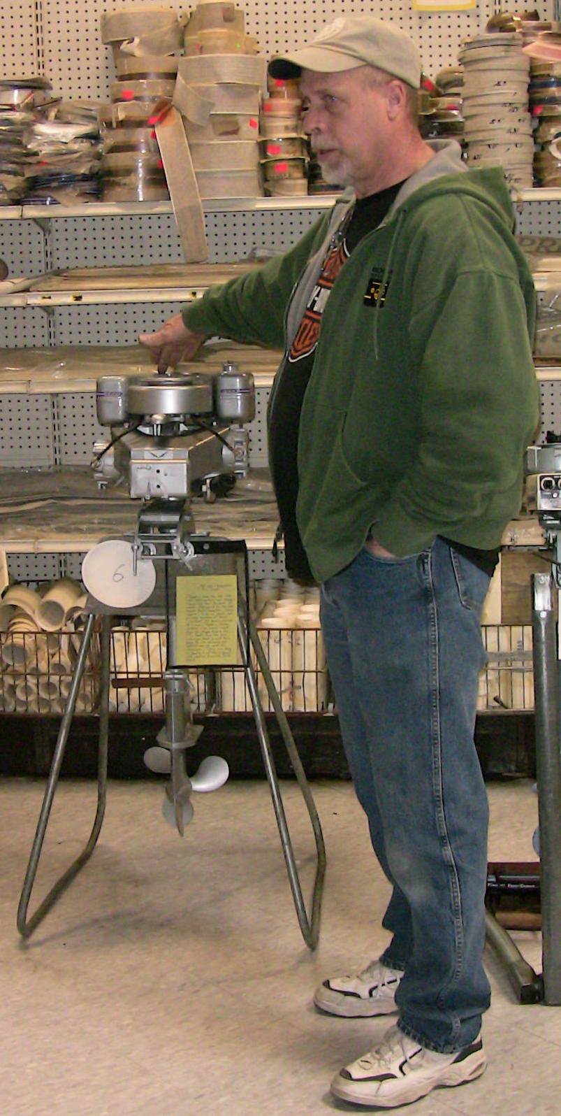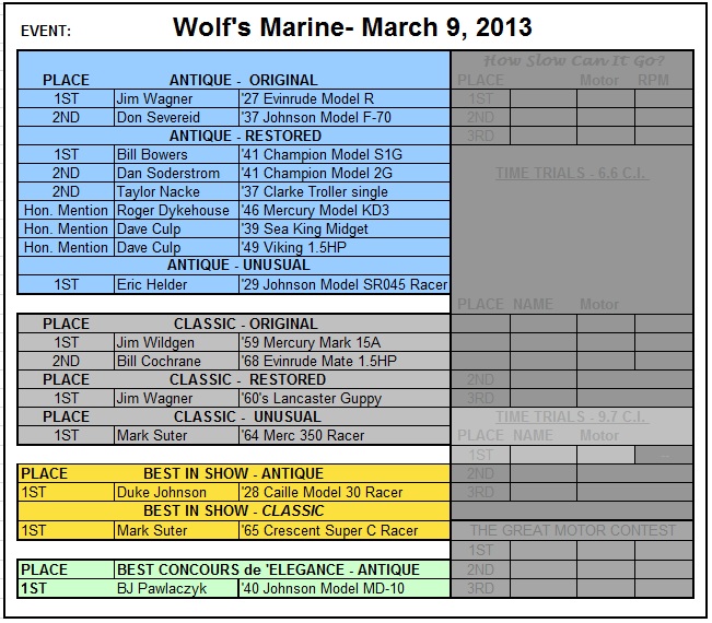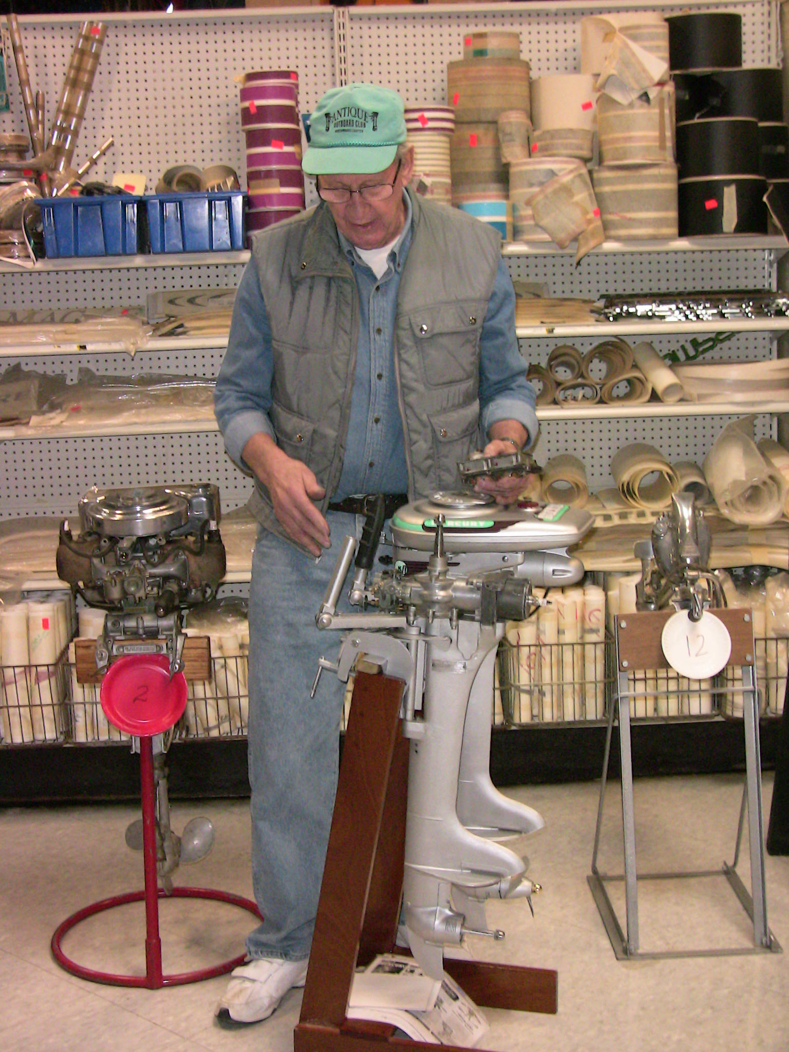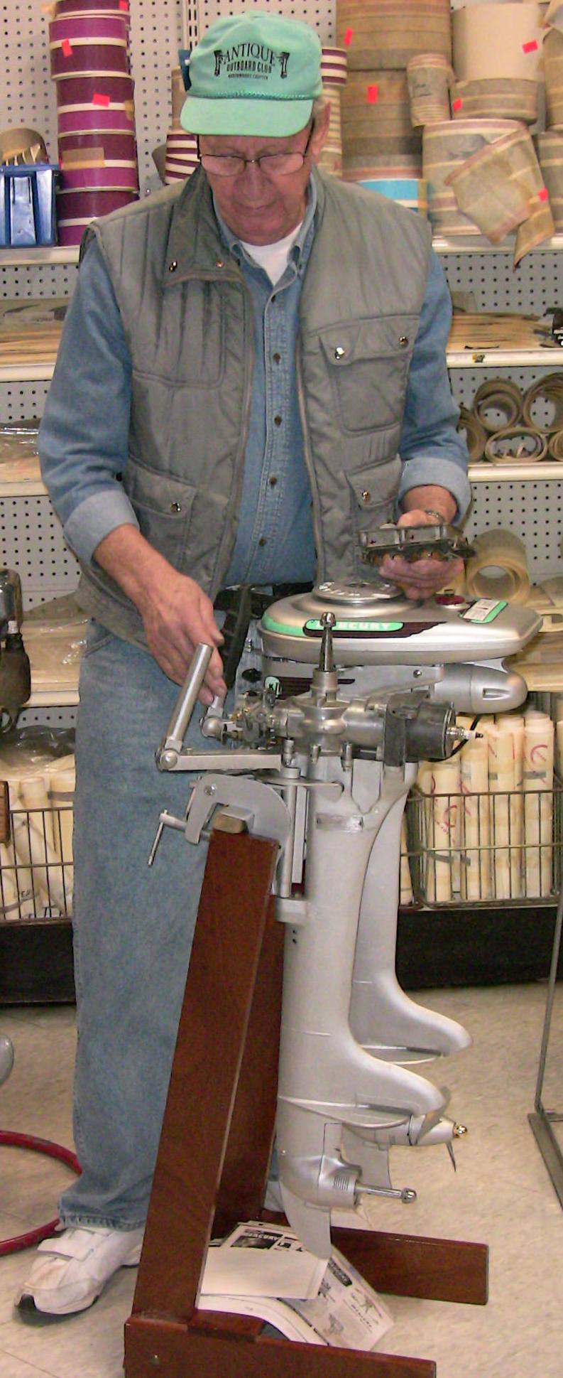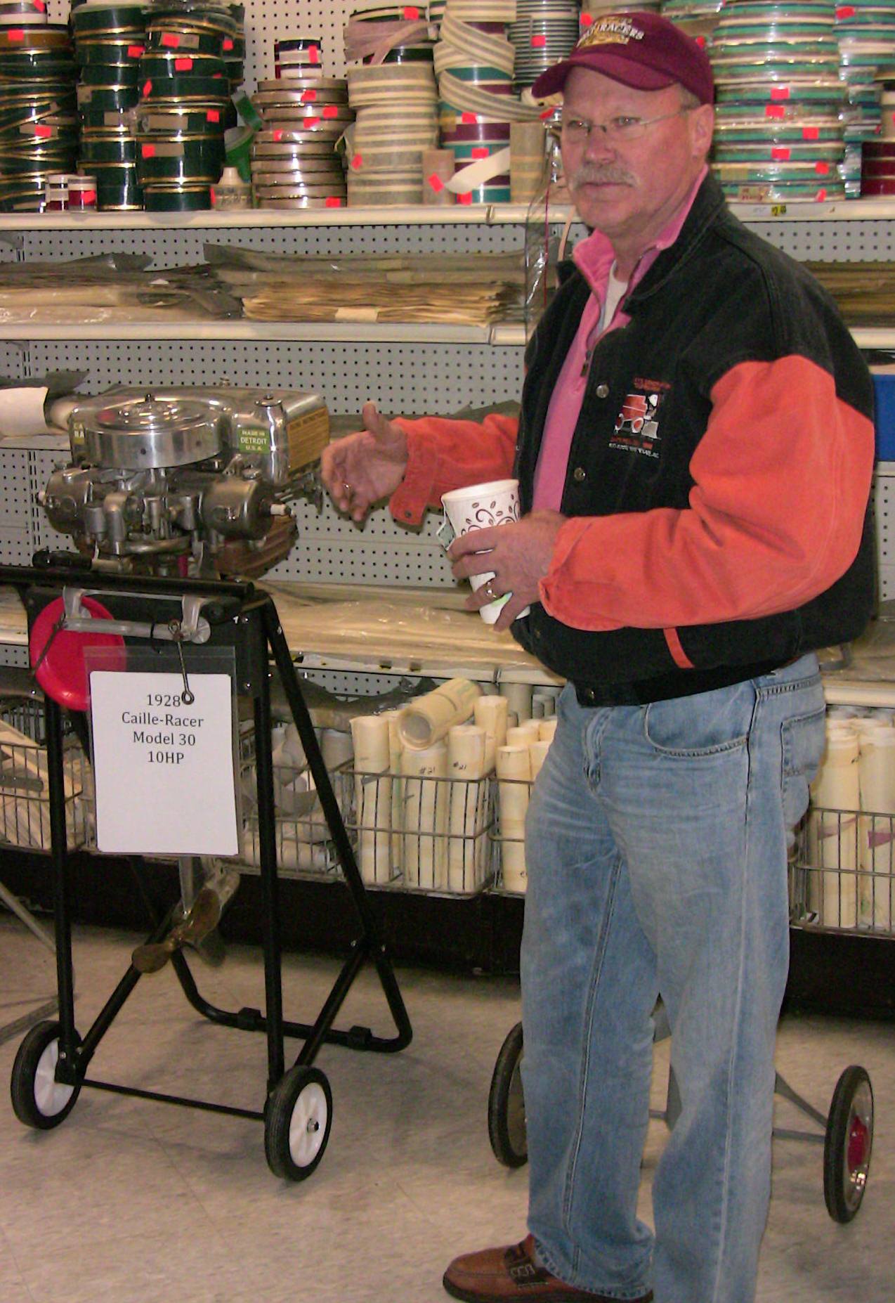 Wolf's Marine was able to supply 3 dozen chairs for our comfort and 4 large tables for our coffee and lunch set-ups and attendance and show-motor registration. That was much appreciated because it eliminated the need to provide any furniture of our own. We had 14 great motors show up for our Peoples' Choice display motor competition. We tried something new for this meet... we had the exhibitor of each of the display motors stand up and give a brief -no longer than 5 minutes - presentation about his or her motor. The information we were looking for could include year produced, brand, model, manufacturer, specifications, distinctive features, condition, history and justification for the show category selected.