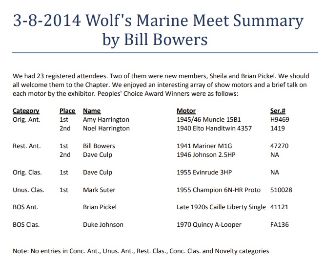 The meet was wrapped up with the Annual Meeting (see minutes in the newsletter). Special thanks go out to Wolf's Marine for use of their facility and to Jim Cronk, Charlene Hamp and Mona Gorz for assistance with the meet.