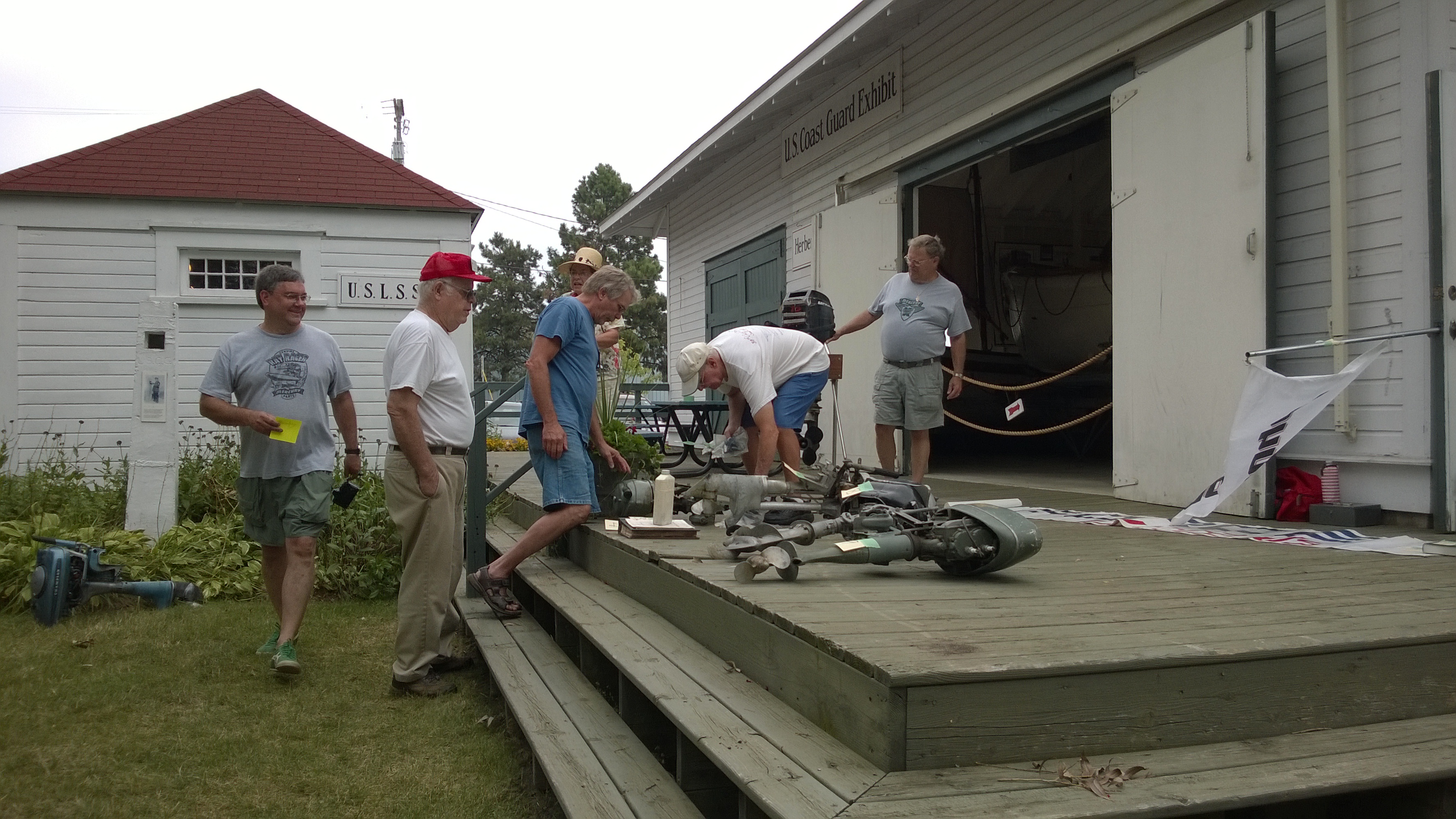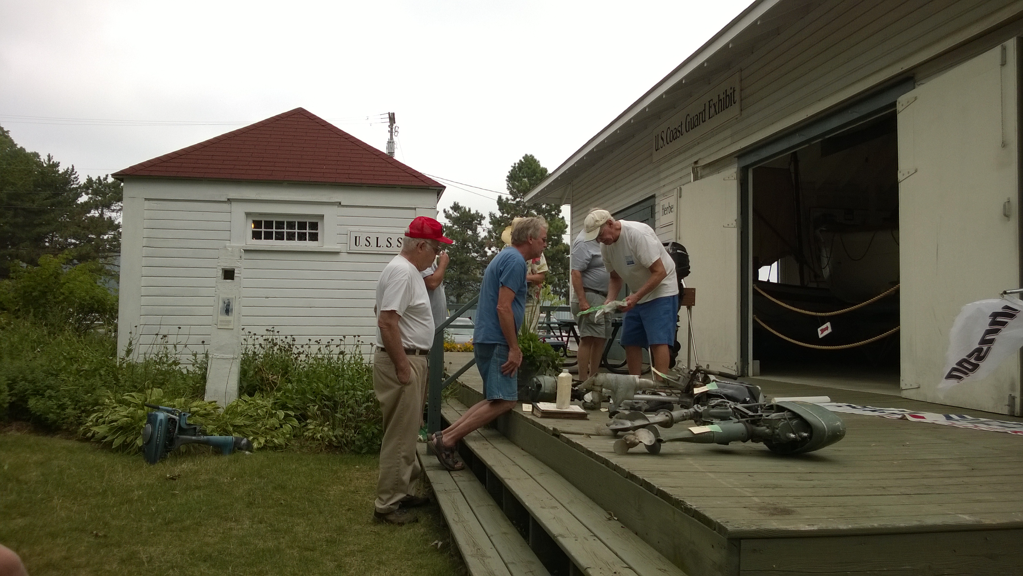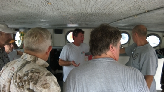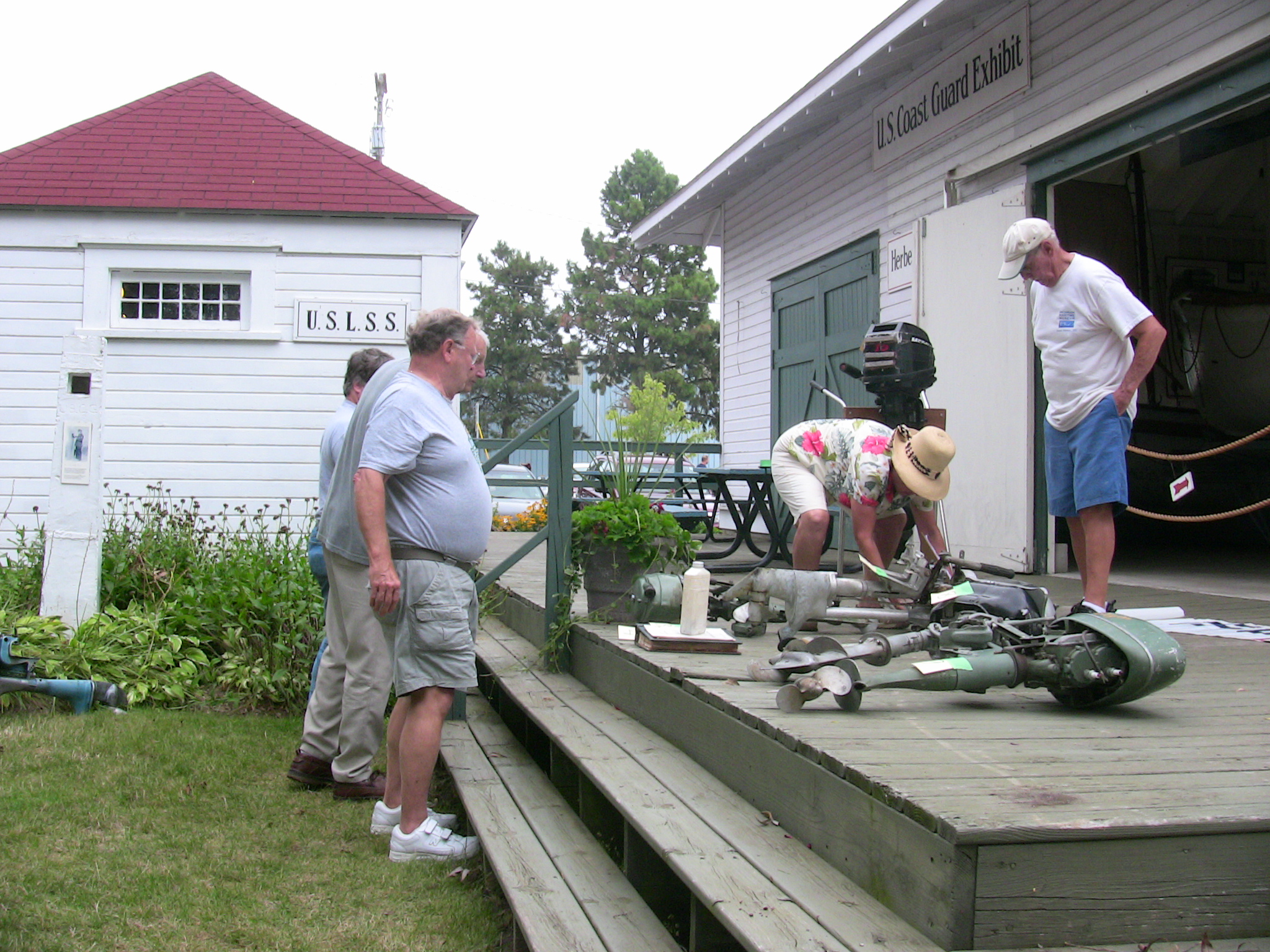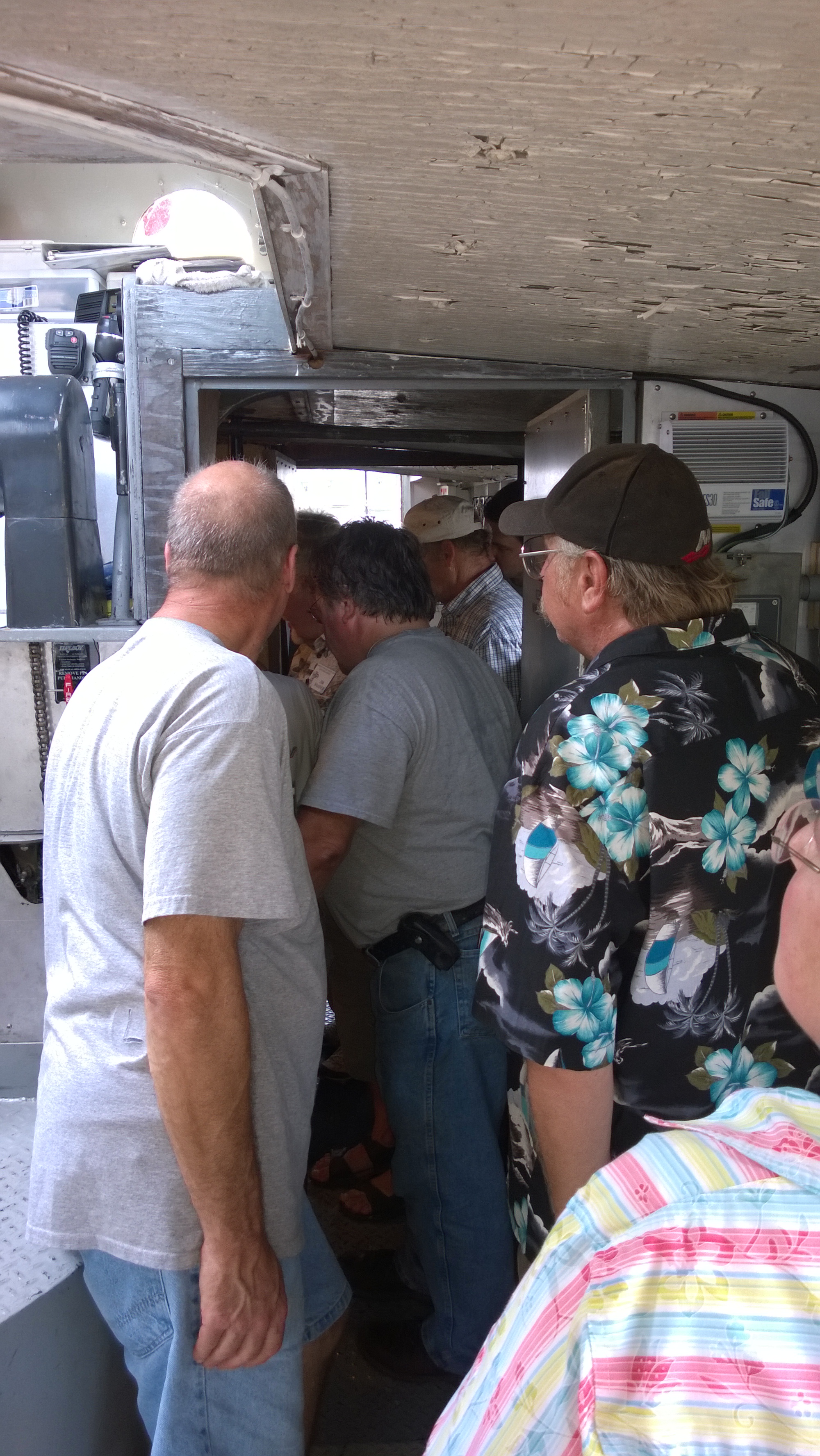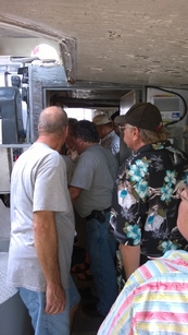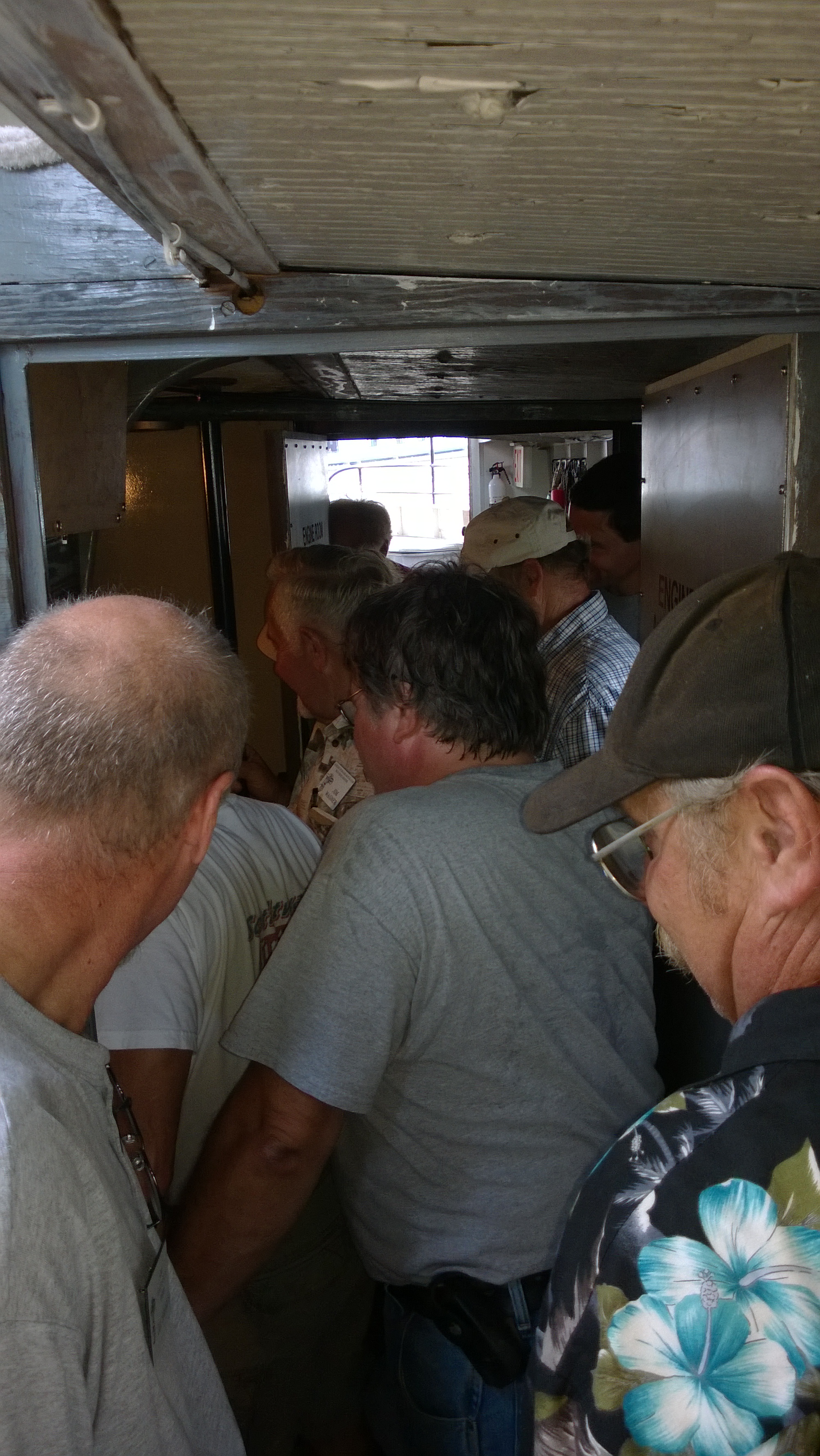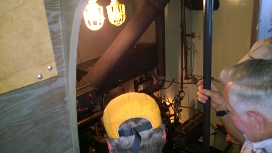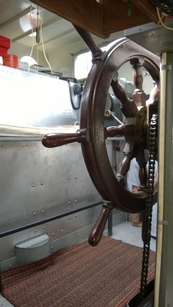 Since so many of our attendees are "motor-heads", the Museum offered to let us gather around the Jensen "Fish Tug", a boat they now use for harbor tours, and let us witness the start-up of its in-line, three cylinder Kannenburg diesel engine. This old critter (from the 1940's?) starts with glow plugs and by spinning the motor over with timed air injection into the cylinders. Some of our members got to stand close to the inboard motor and some of us, because of limited space around the engine, were relegated to standing on the dock adjacent to the boat (I was in the latter group). After going through the check list to make sure the proper starting procedure was followed, the engineer (a member of the Jensen family) finally started the air injection and it wasn't long until the engine was cranking fast enough and the exhaust pipe belched a big black cloud of diesel exhaust signifying the started up was successful. It was truly fun to witness this event... a long as you were NOT standing downwind of the exhaust pipe. Two of our attendees opted to take the ensuing cruise in the boat.