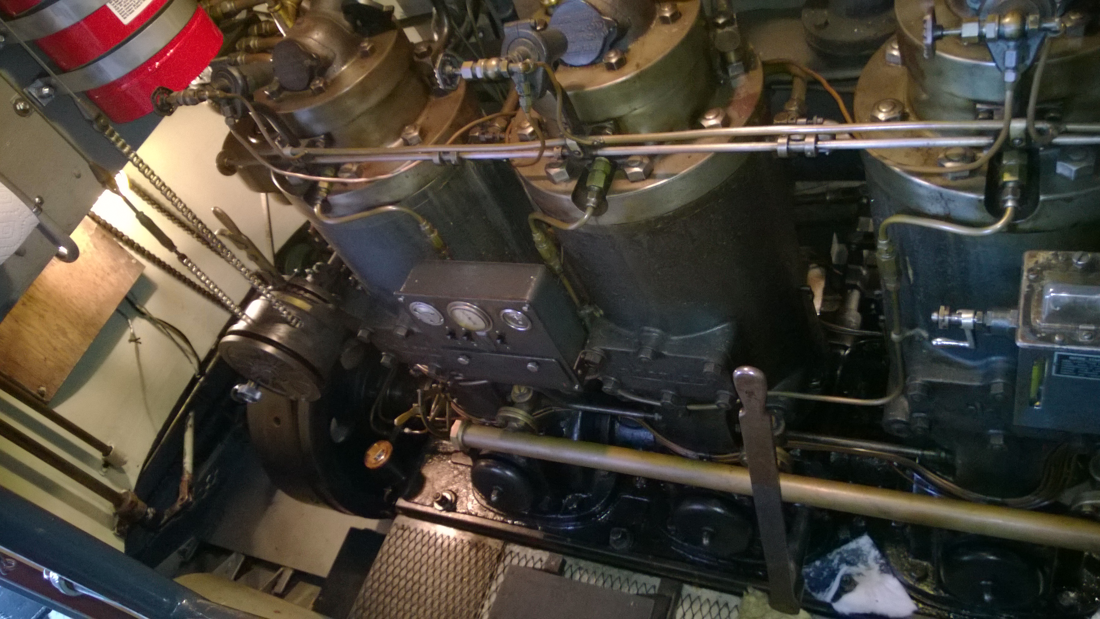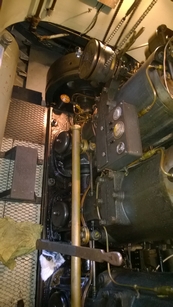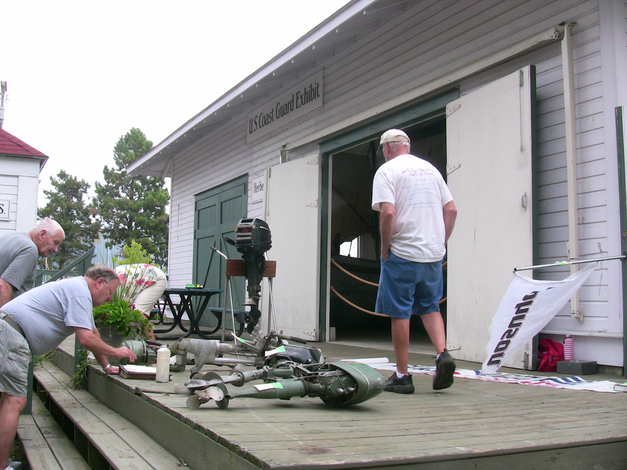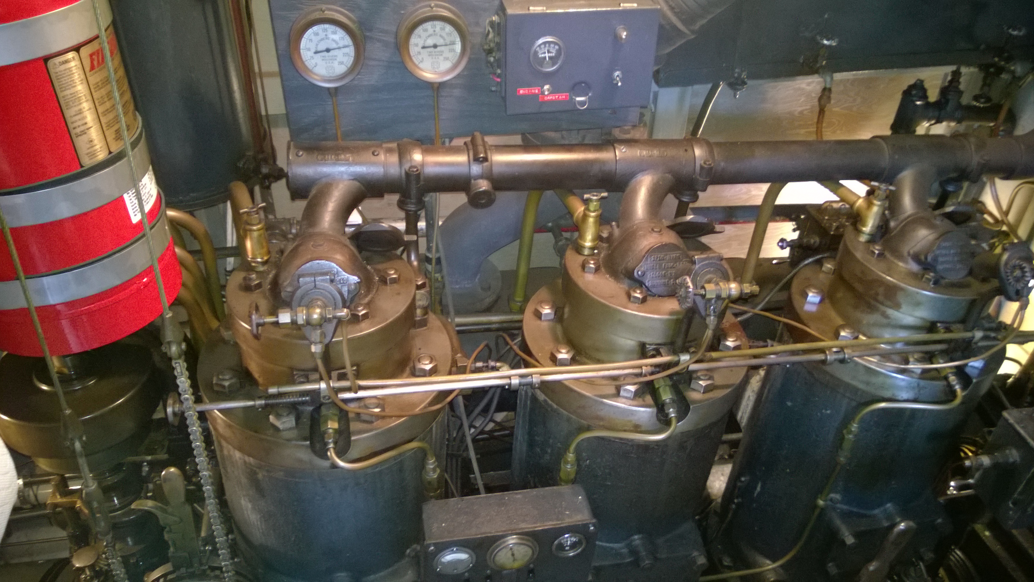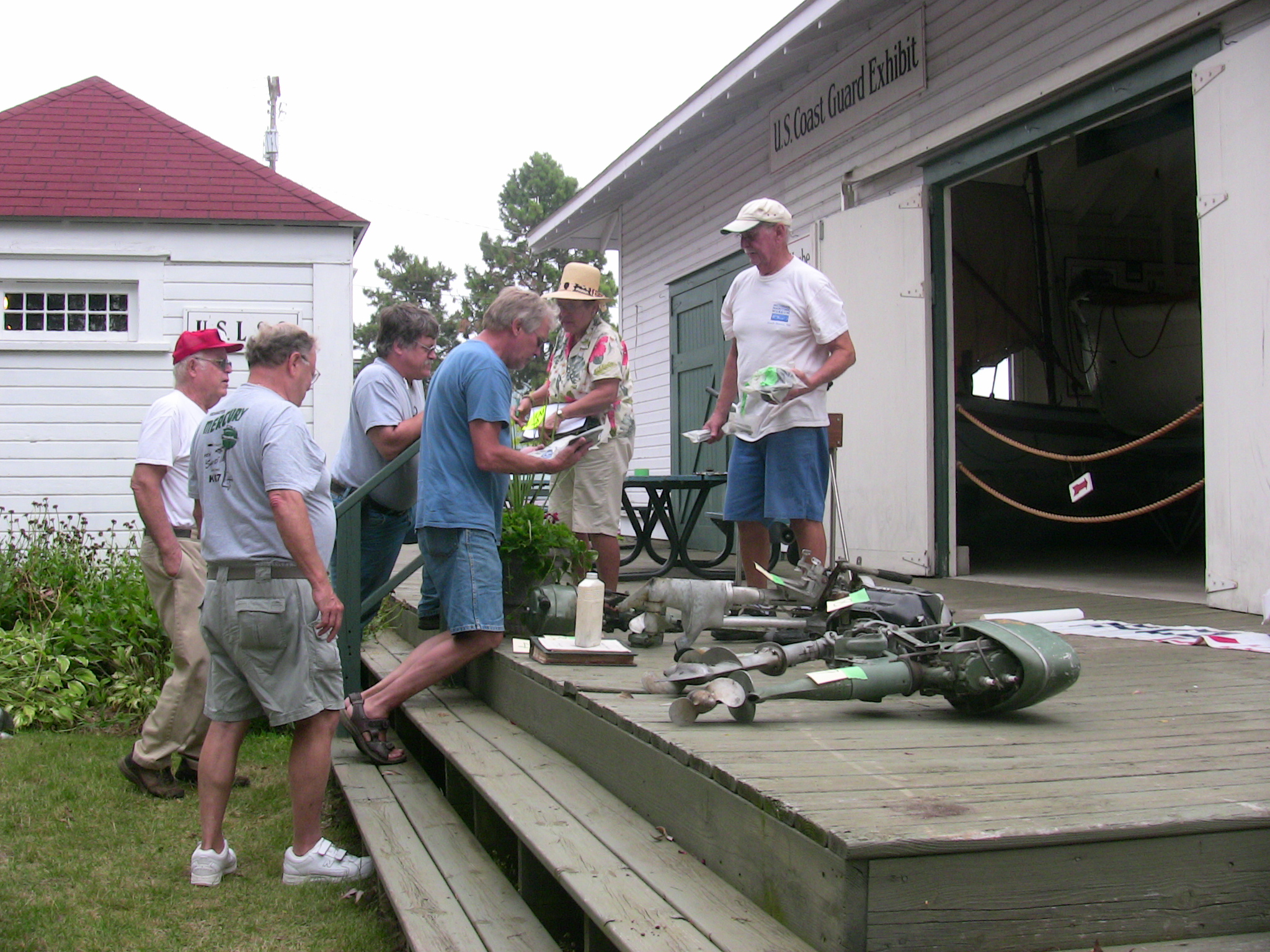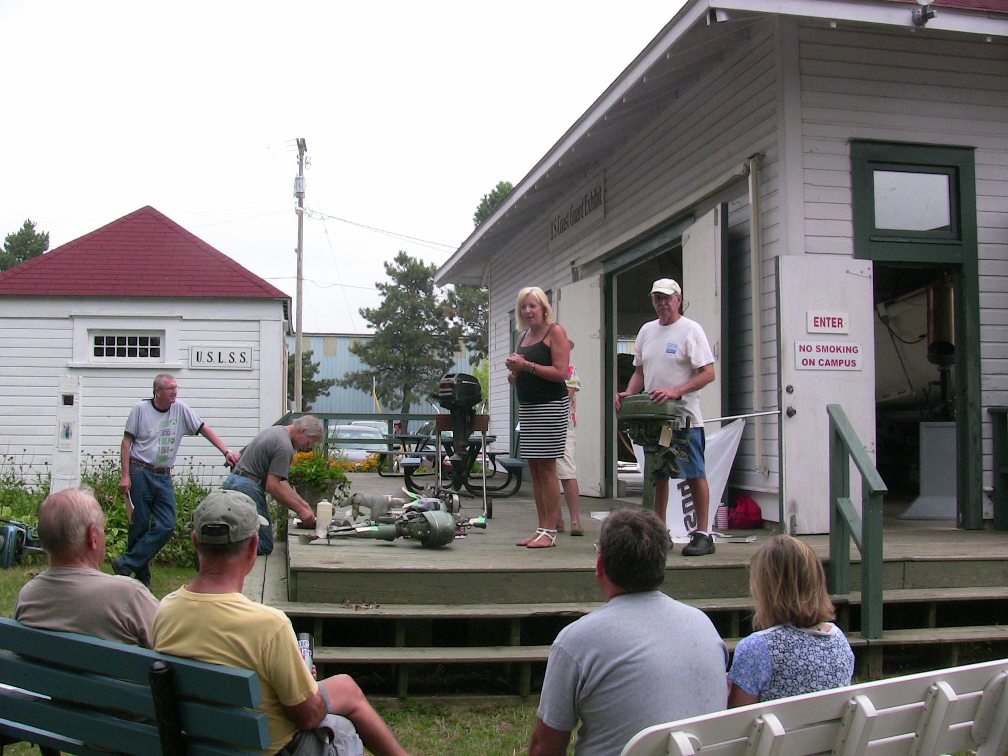 Since so many of our attendees are "motor-heads", the Museum offered to let us gather around the Jensen "Fish Tug", a boat they now use for harbor tours, and let us witness the start-up of its in-line, three cylinder Kannenburg diesel engine. This old critter (from the 1940's?) starts with glow plugs and by spinning the motor over with timed air injection into the cylinders. Some of our members got to stand close to the inboard motor and some of us, because of limited space around the engine, were relegated to standing on the dock adjacent to the boat (I was in the latter group). After going through the check list to make sure the proper starting procedure was followed, the engineer (a member of the Jensen family) finally started the air injection and it wasn't long until the engine was cranking fast enough and the exhaust pipe belched a big black cloud of diesel exhaust signifying the started up was successful. It was truly fun to witness this event... a long as you were NOT standing downwind of the exhaust pipe. Two of our attendees opted to take the ensuing cruise in the boat.