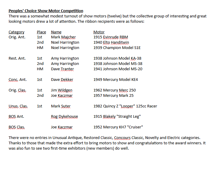 There was a somewhat modest turnout of show motors (twelve) but the collective group of interesting and great looking motors drew a lot of attention. he ribbon recipients can be found in the image under Meet_Results.