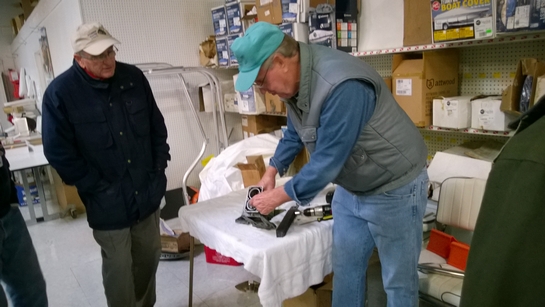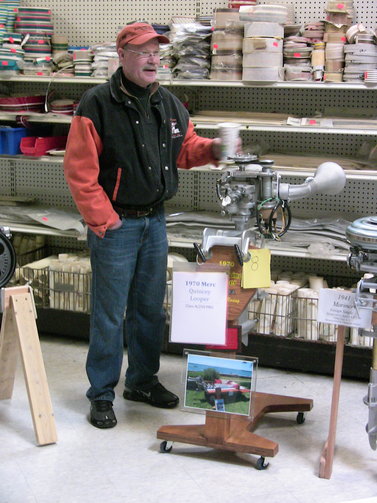 Those present enjoyed coffee, hot tea and hot cocoa along with sweet rolls. For lunch we enjoyed chicken, potato salad, coleslaw and rolls for the main course and chop suey and oatmeal cakes with beverages. Rog Dykehouse gave an excellent show & tell demonstration with actual hardware (partial powerhead assemblies) to explain the difference between cross-flow scavenged and loop-scavenged 2-cycle engines.