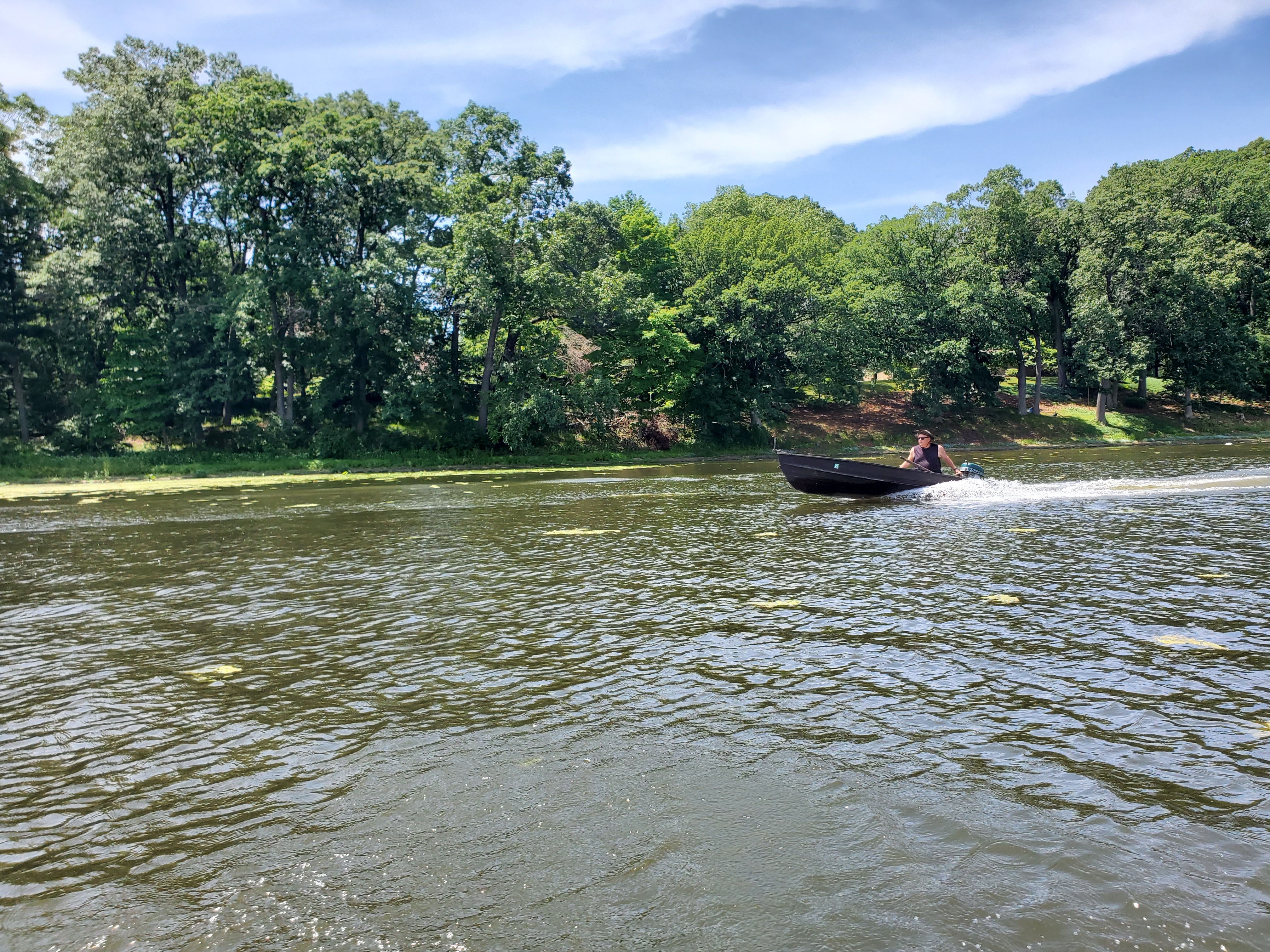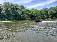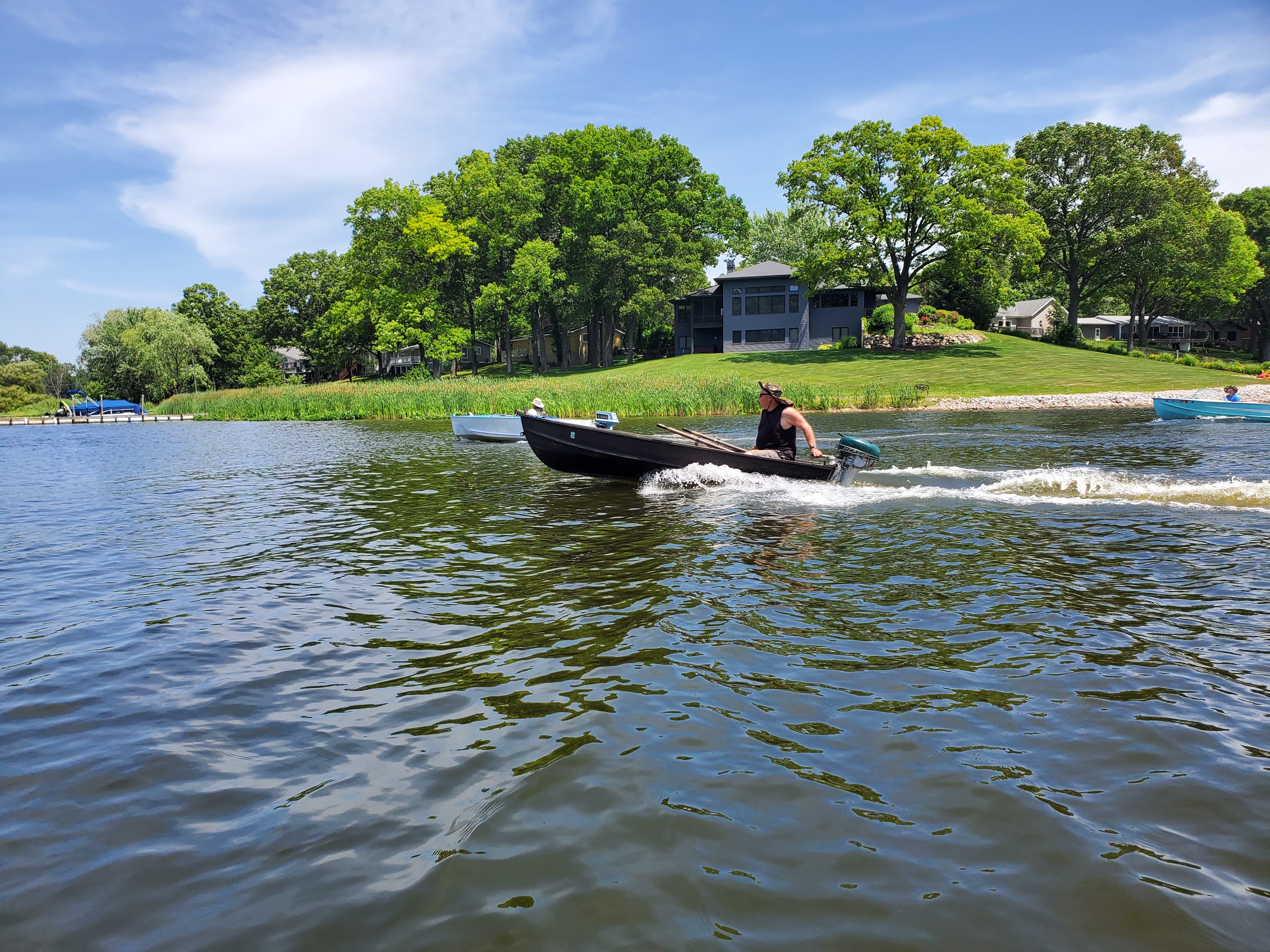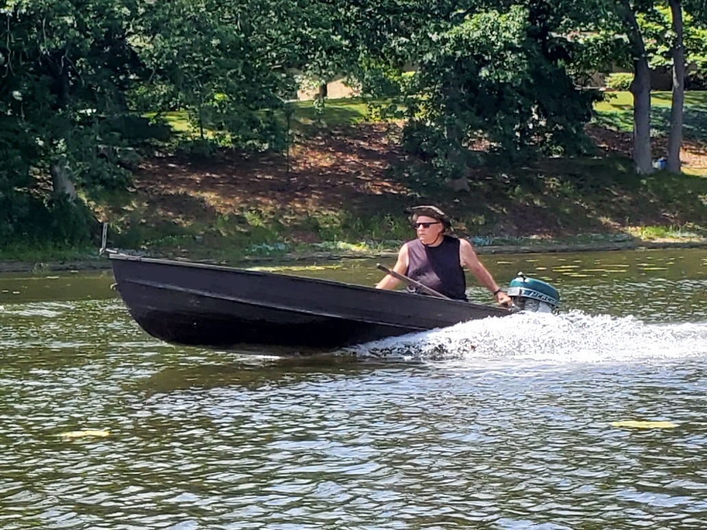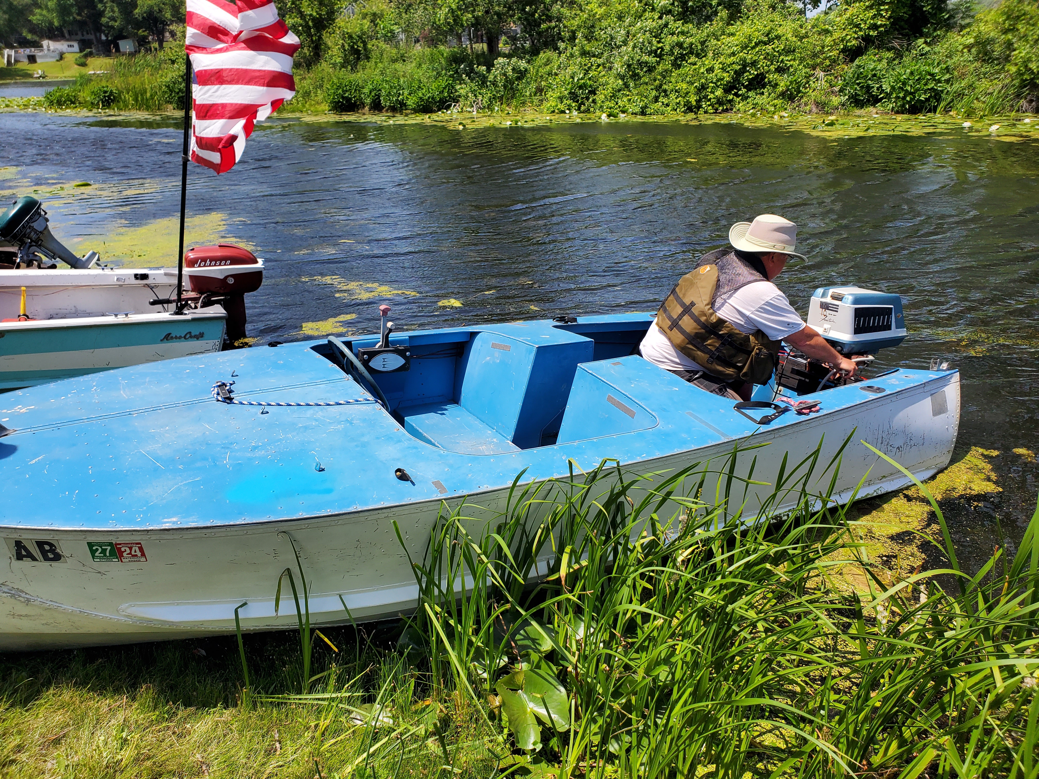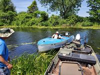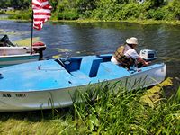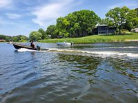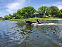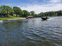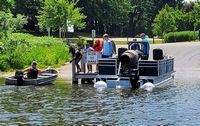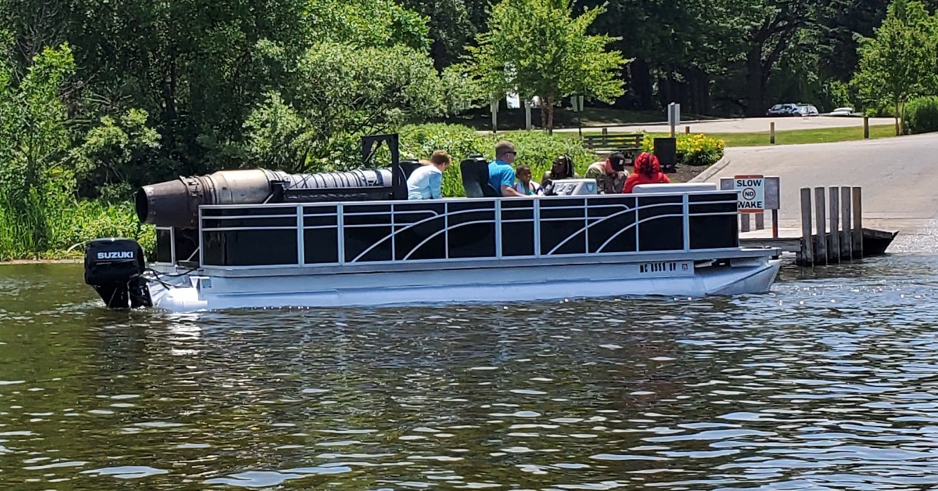 It was a hot, sunny day, but a strong breeze, a large shady tree, and Felix's water fan kept us cooled and happy. Craig (and Fritz) did an outstanding job hosting the meet and providing a delicious lunch! We had a meet first - president Bill Shattuck launched one of his boats and ran around the lake like the rest of us crazies - check the pictures for an aqua blue boat with Bill driving! We spotted an interesting sight while out on the water - a turbine powered pontoon boat! Check the pictures under the BOATS heading and see if you can spot it.