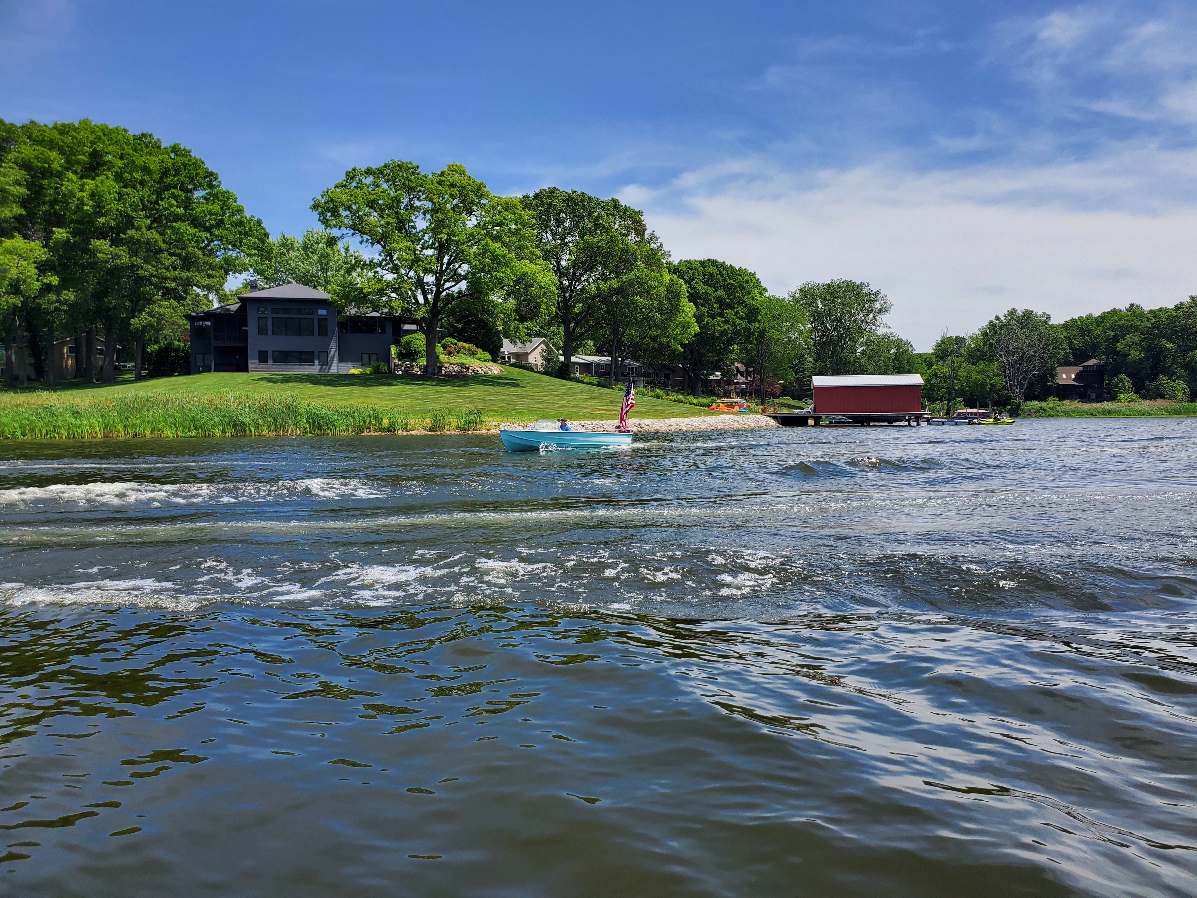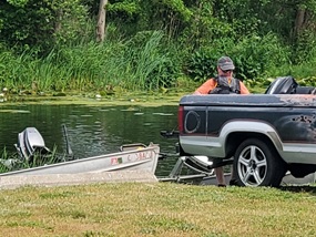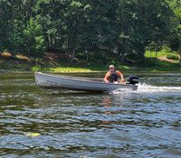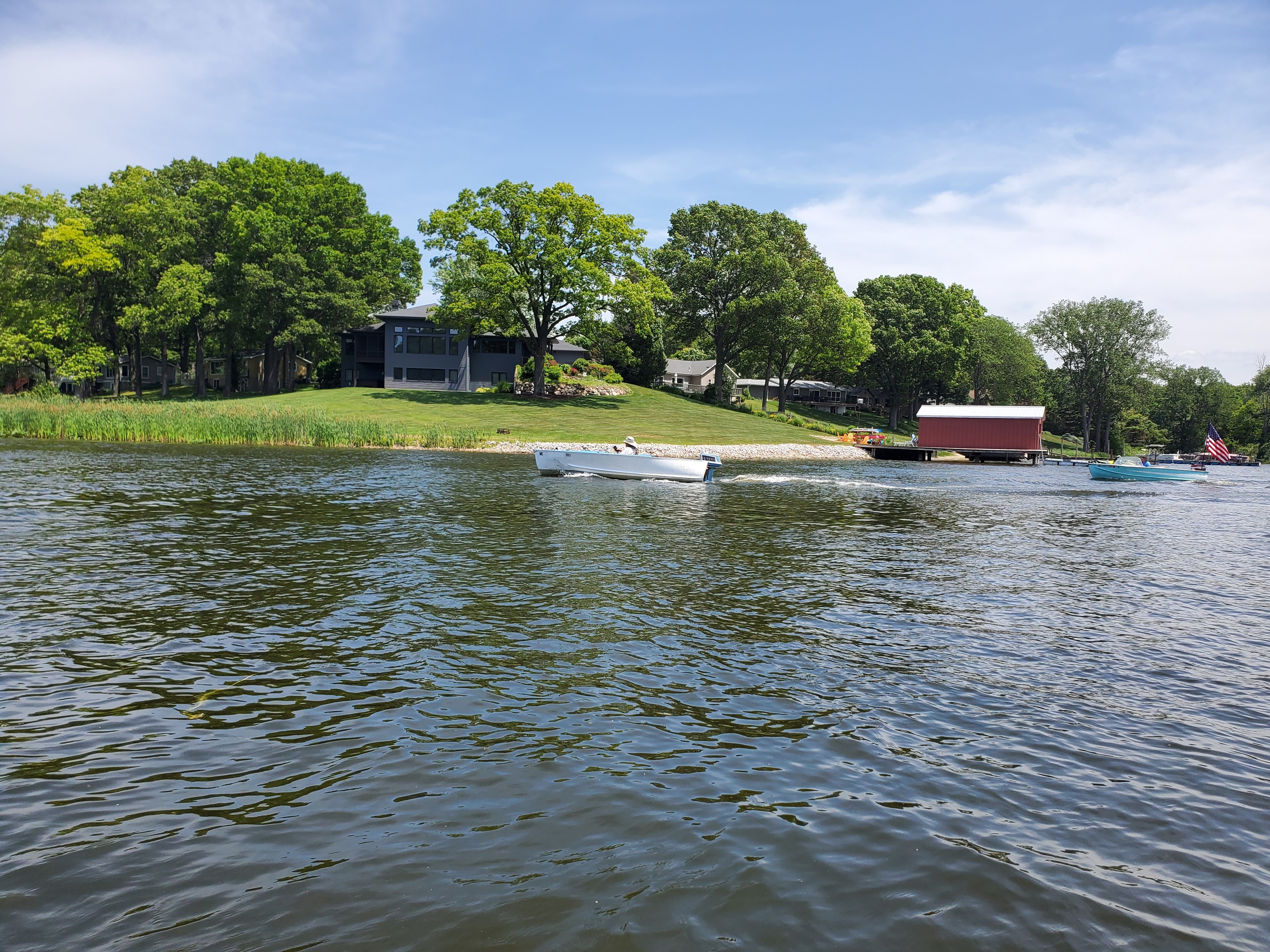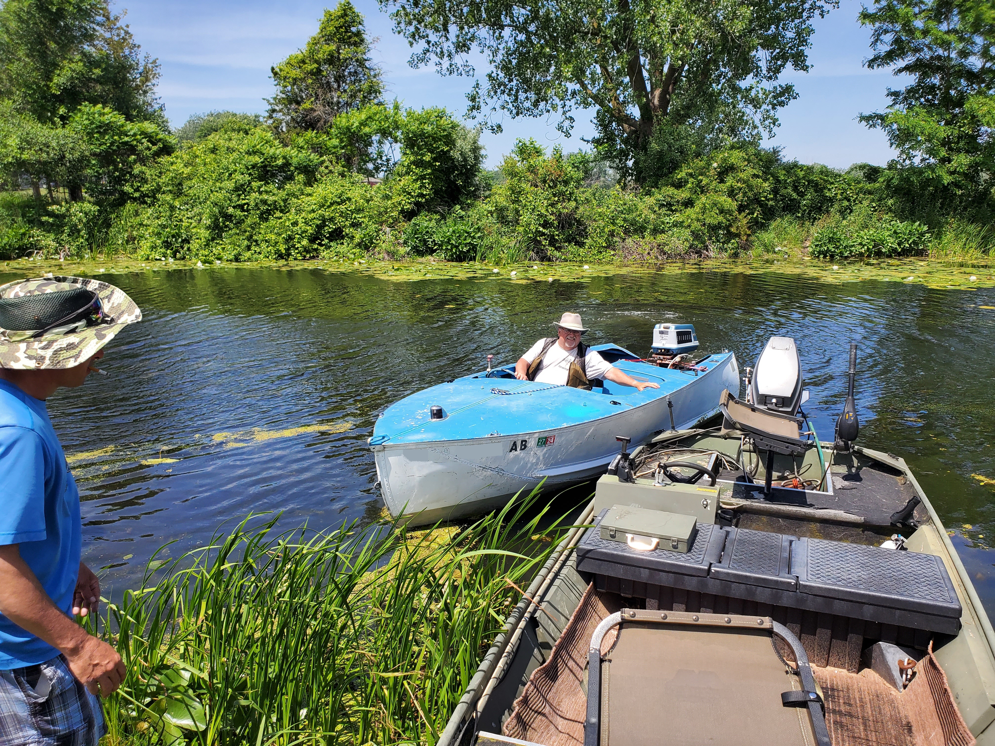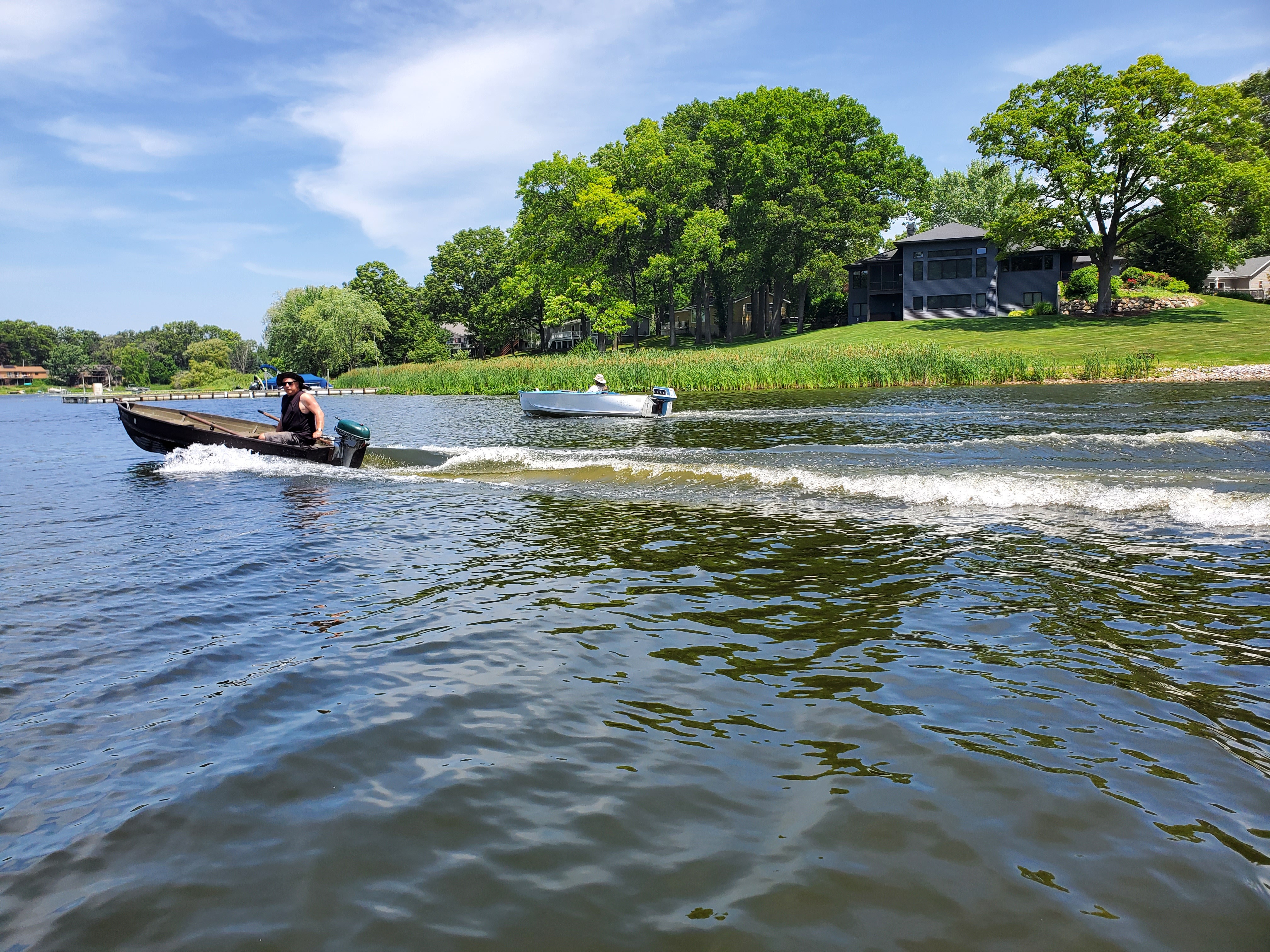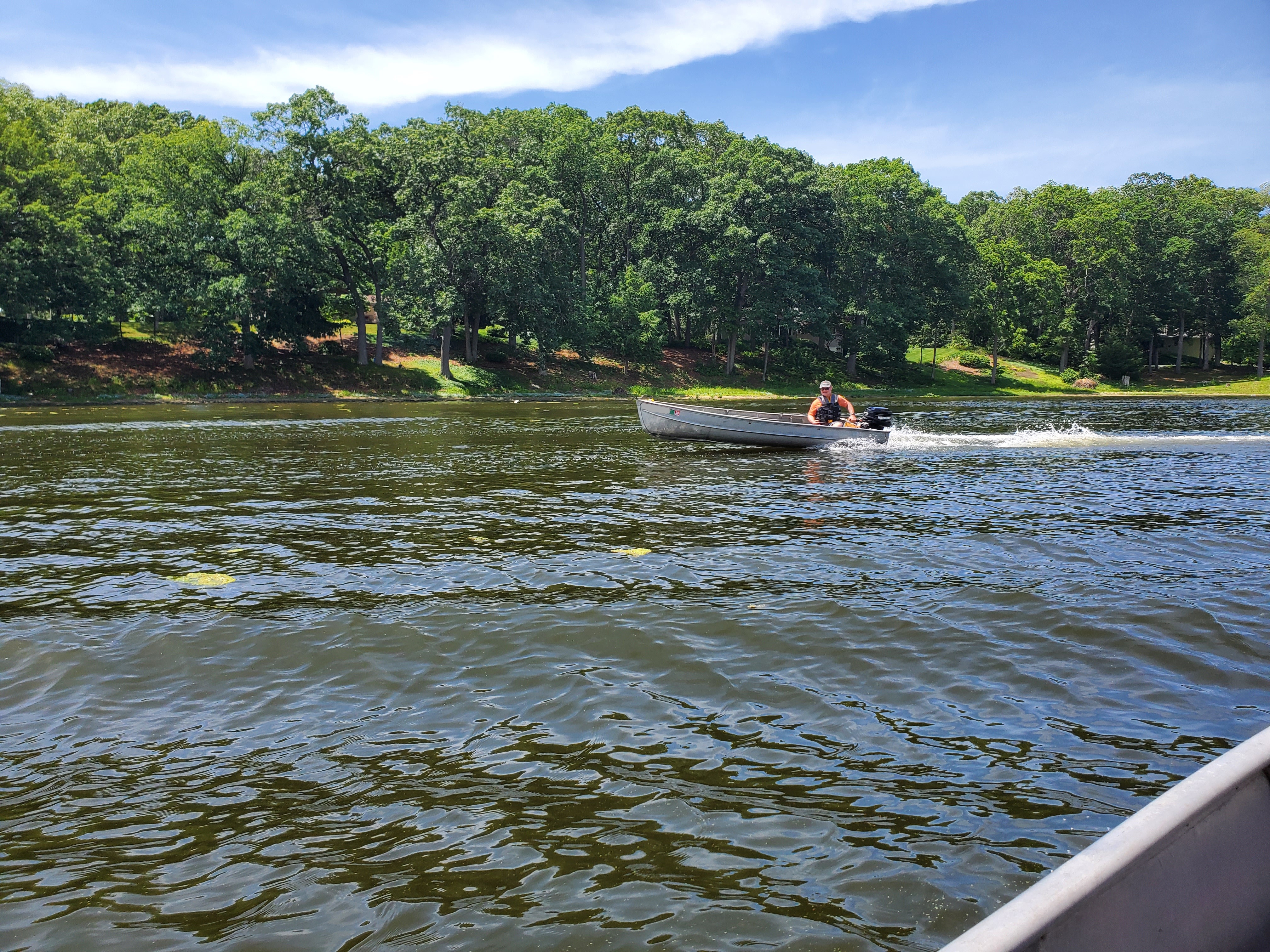 It was a hot, sunny day, but a strong breeze, a large shady tree, and Felix's water fan kept us cooled and happy. Craig (and Fritz) did an outstanding job hosting the meet and providing a delicious lunch! We had a meet first - president Bill Shattuck launched one of his boats and ran around the lake like the rest of us crazies - check the pictures for an aqua blue boat with Bill driving! We spotted an interesting sight while out on the water - a turbine powered pontoon boat! Check the pictures under the BOATS heading and see if you can spot it.
