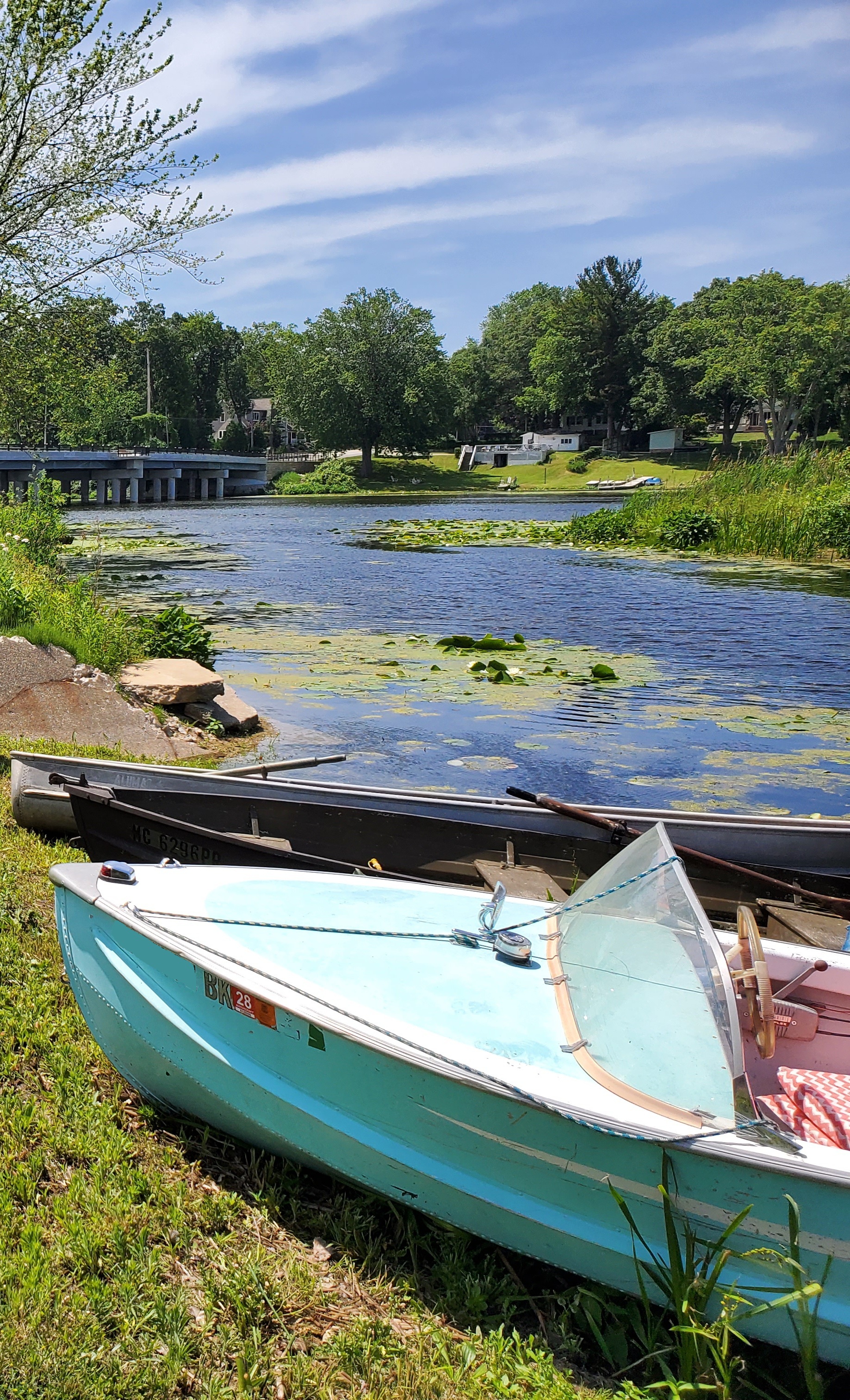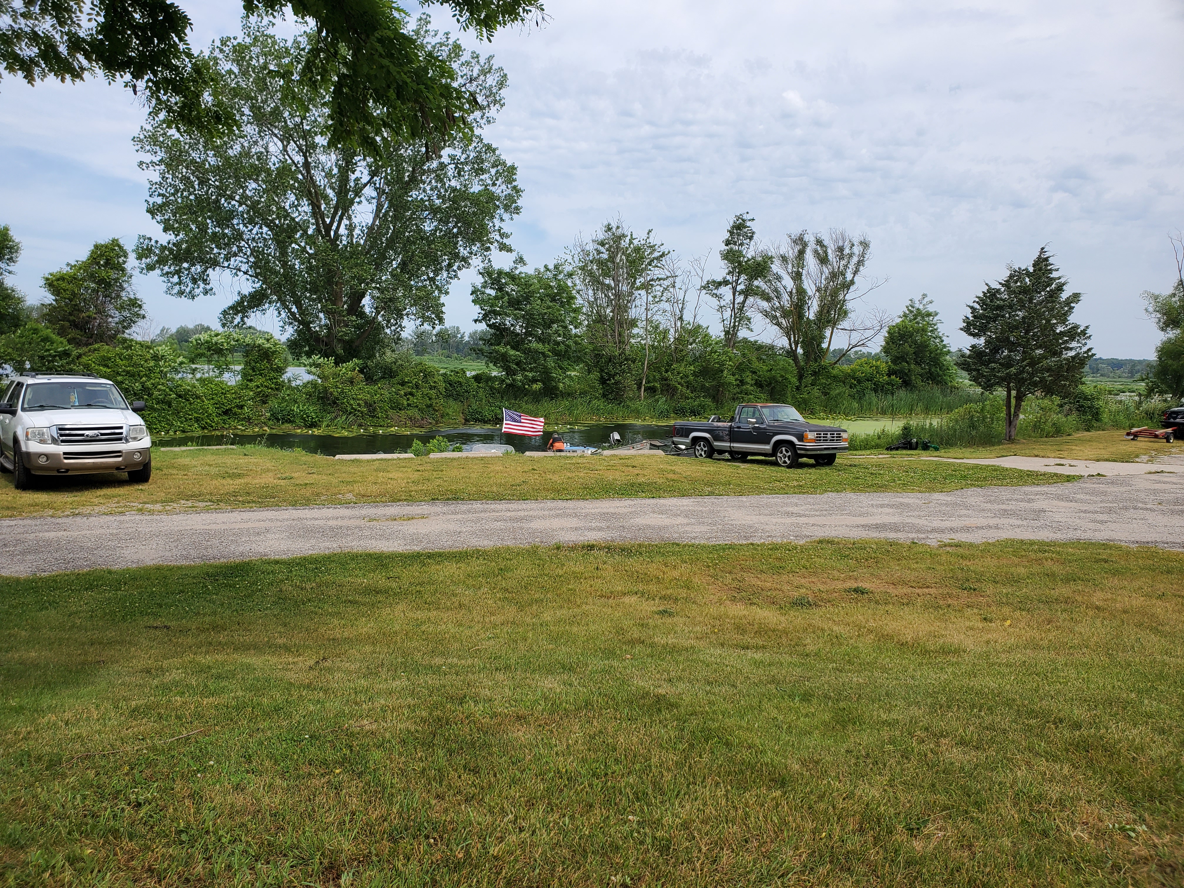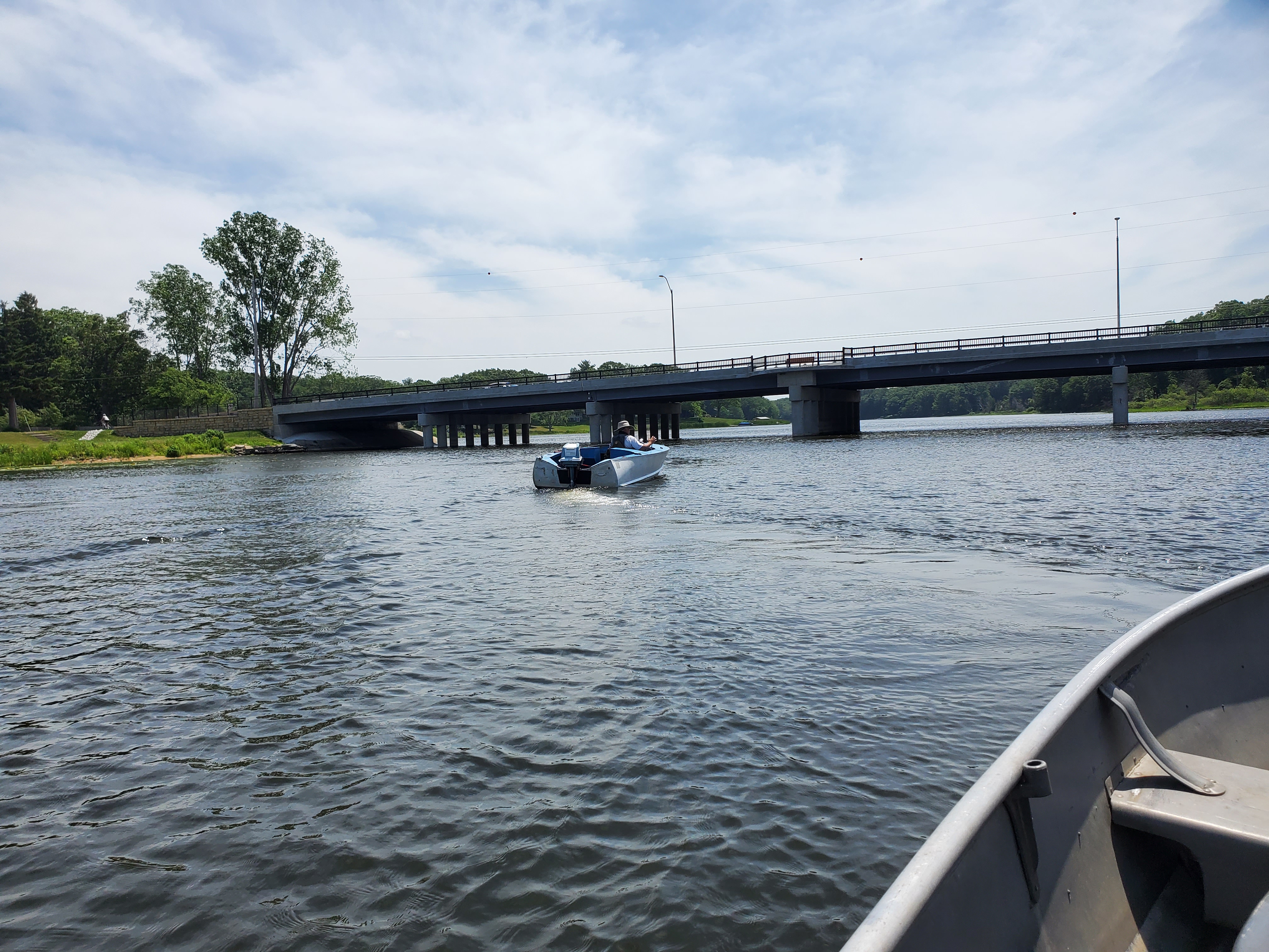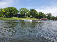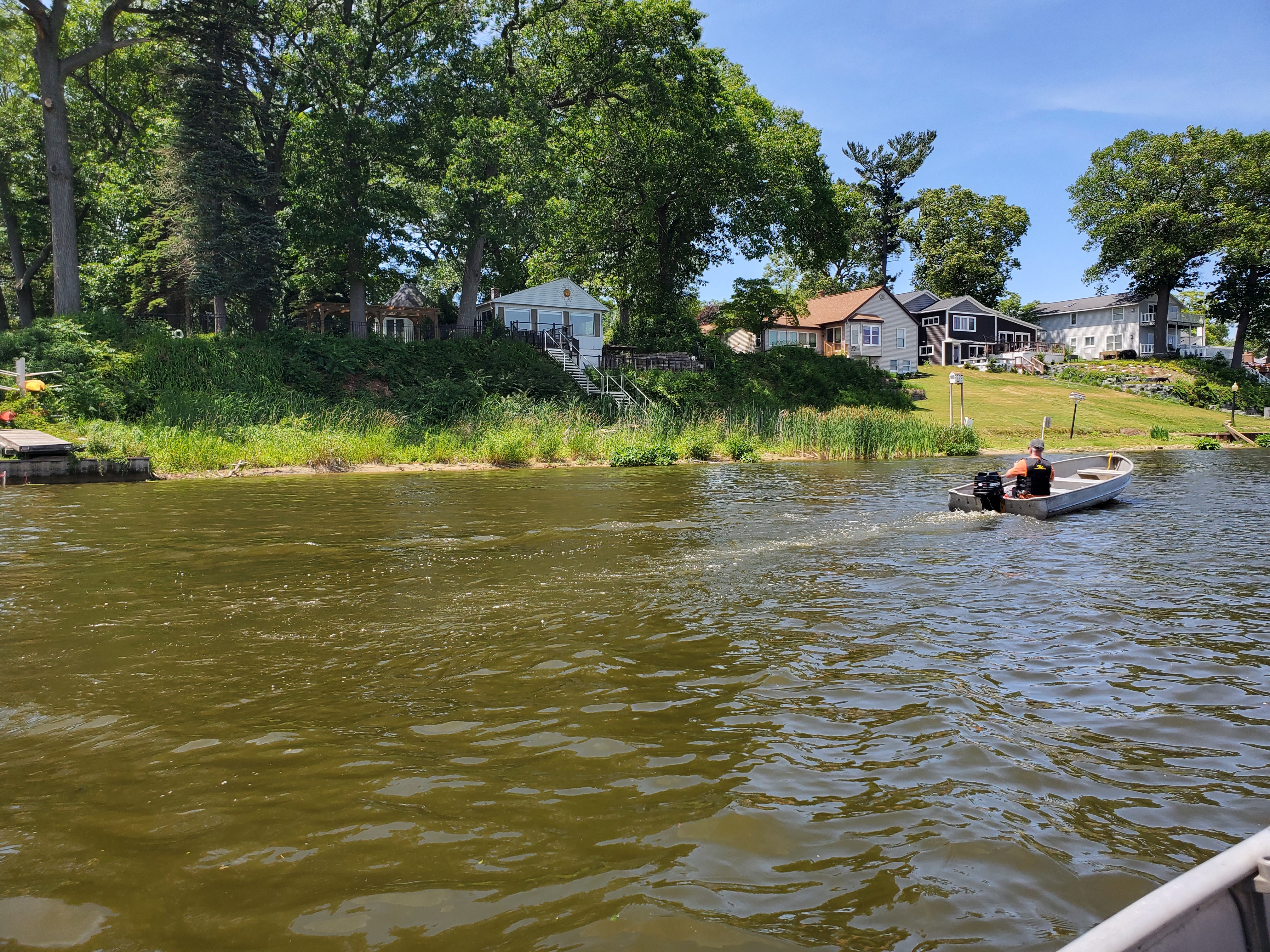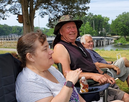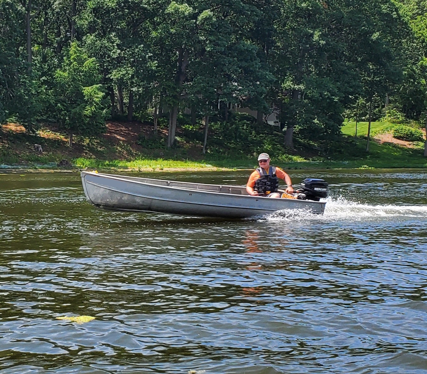 It was a hot, sunny day, but a strong breeze, a large shady tree, and Felix's water fan kept us cooled and happy. Craig (and Fritz) did an outstanding job hosting the meet and providing a delicious lunch! We had a meet first - president Bill Shattuck launched one of his boats and ran around the lake like the rest of us crazies - check the pictures for an aqua blue boat with Bill driving! We spotted an interesting sight while out on the water - a turbine powered pontoon boat! Check the pictures under the BOATS heading and see if you can spot it.