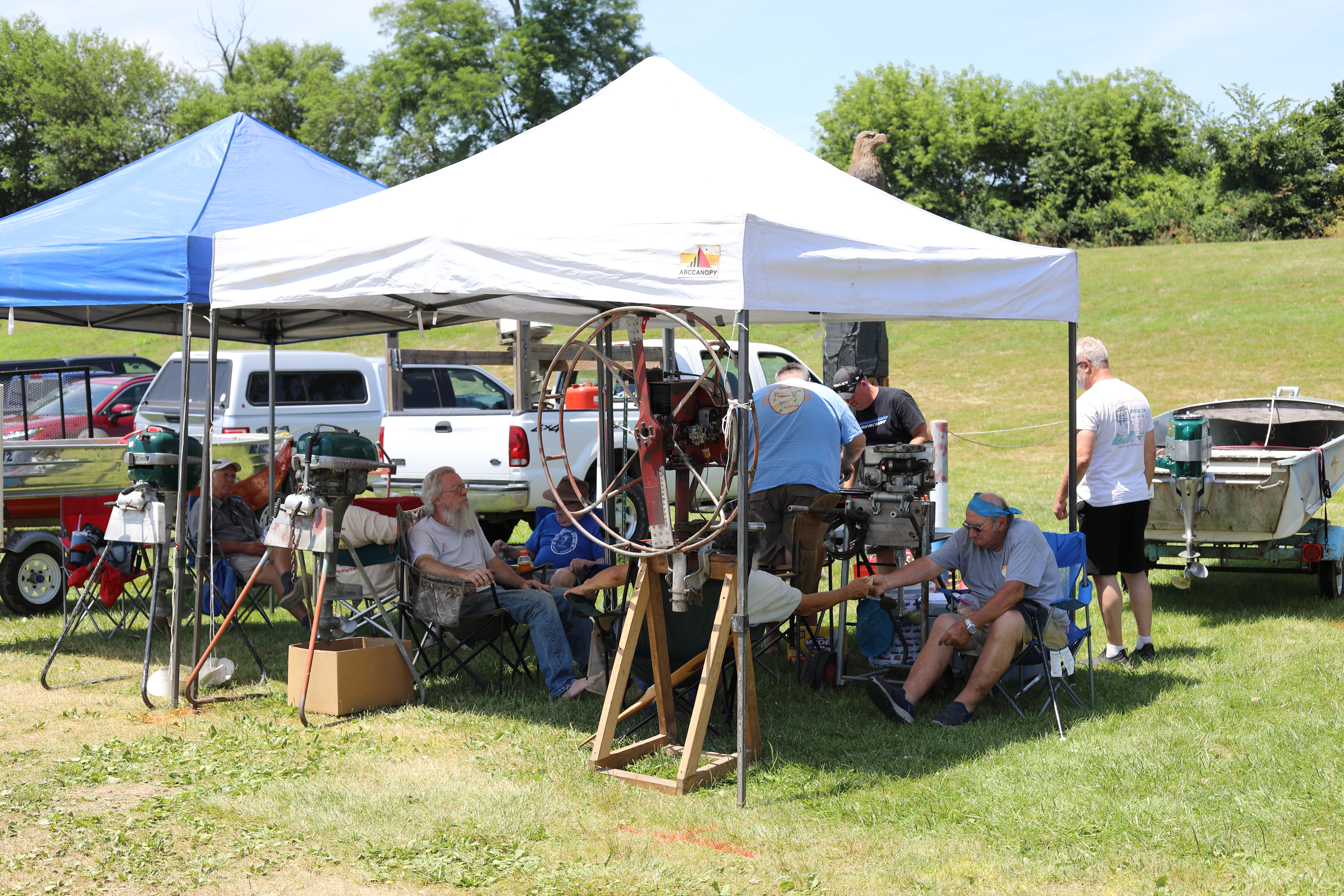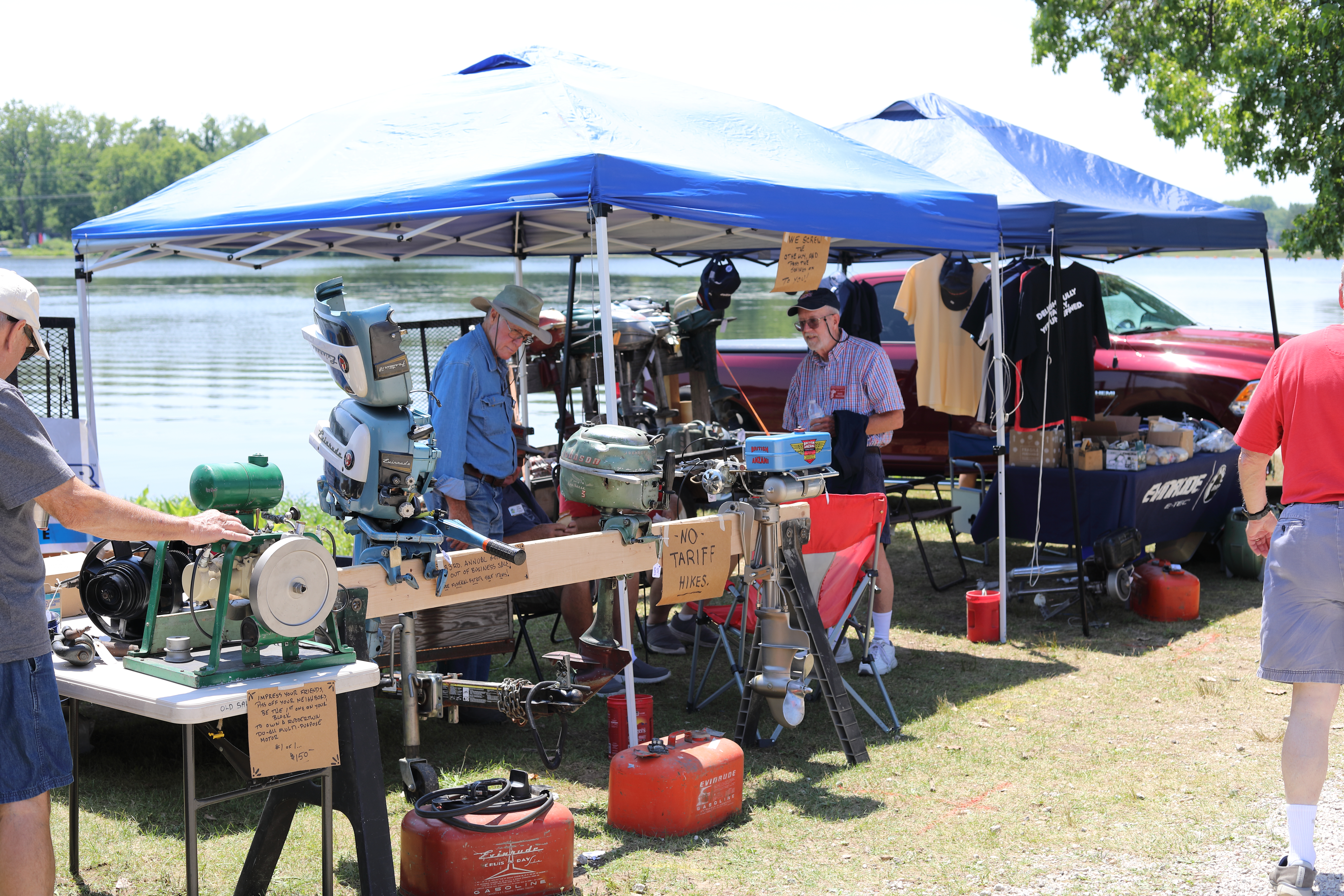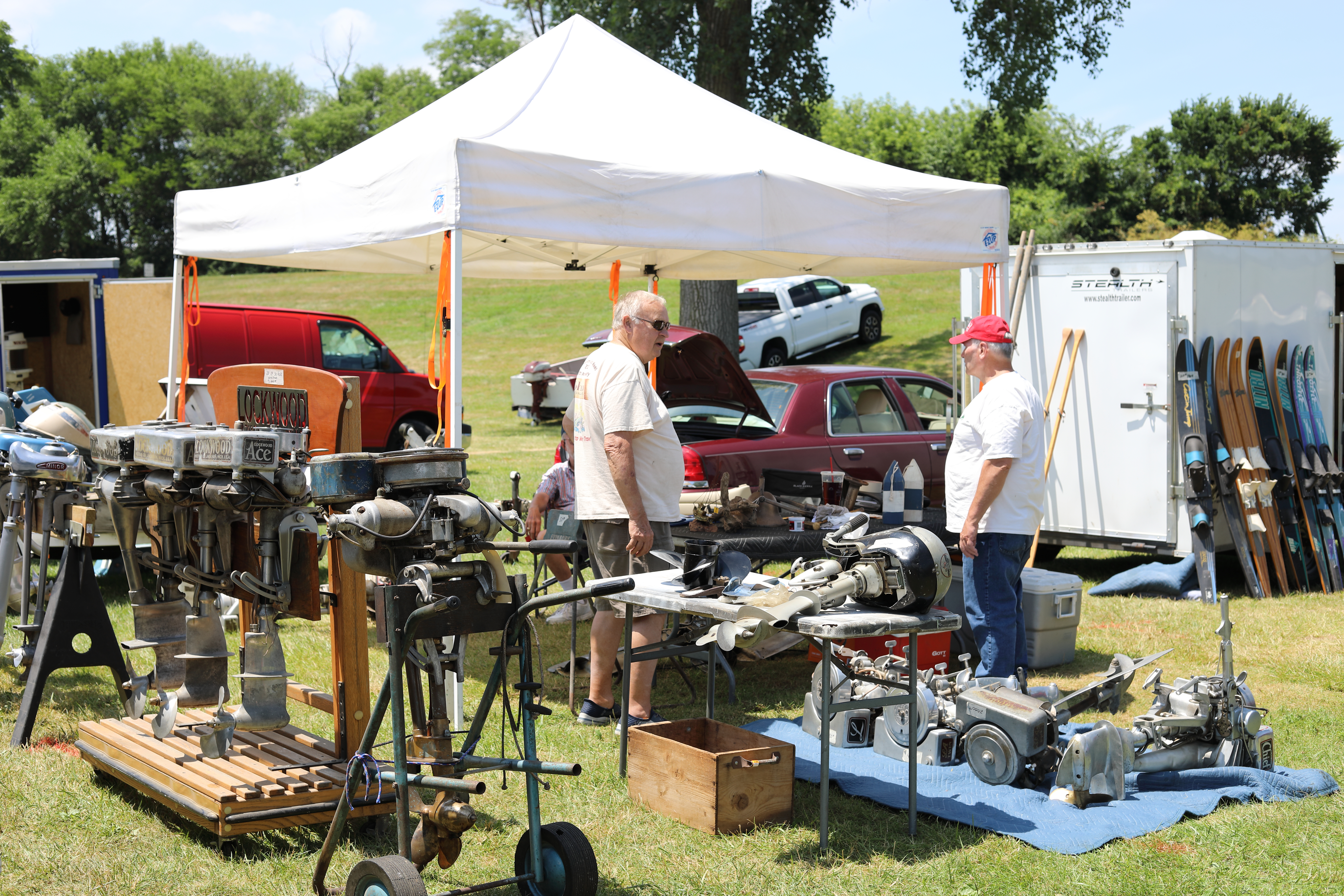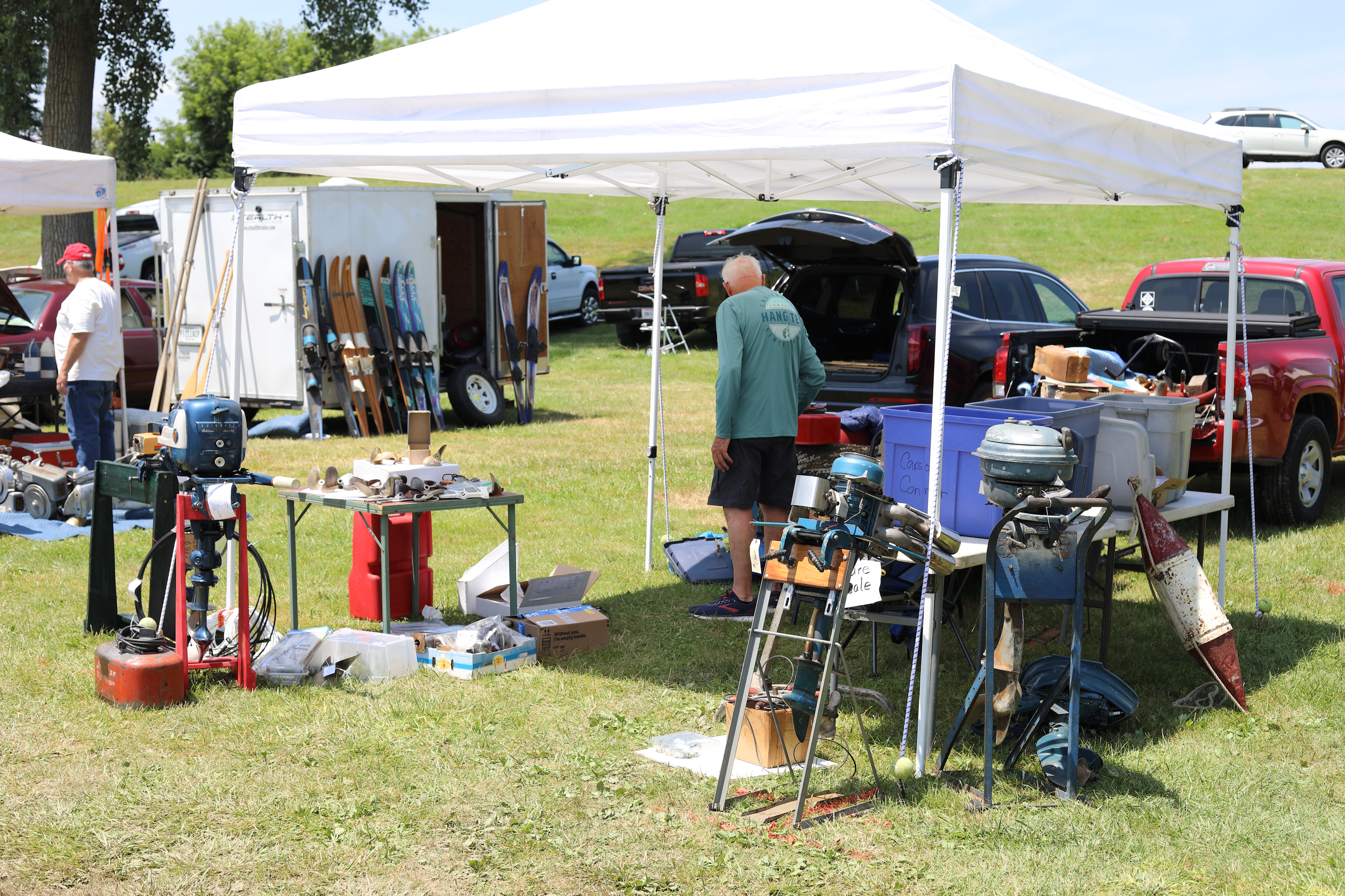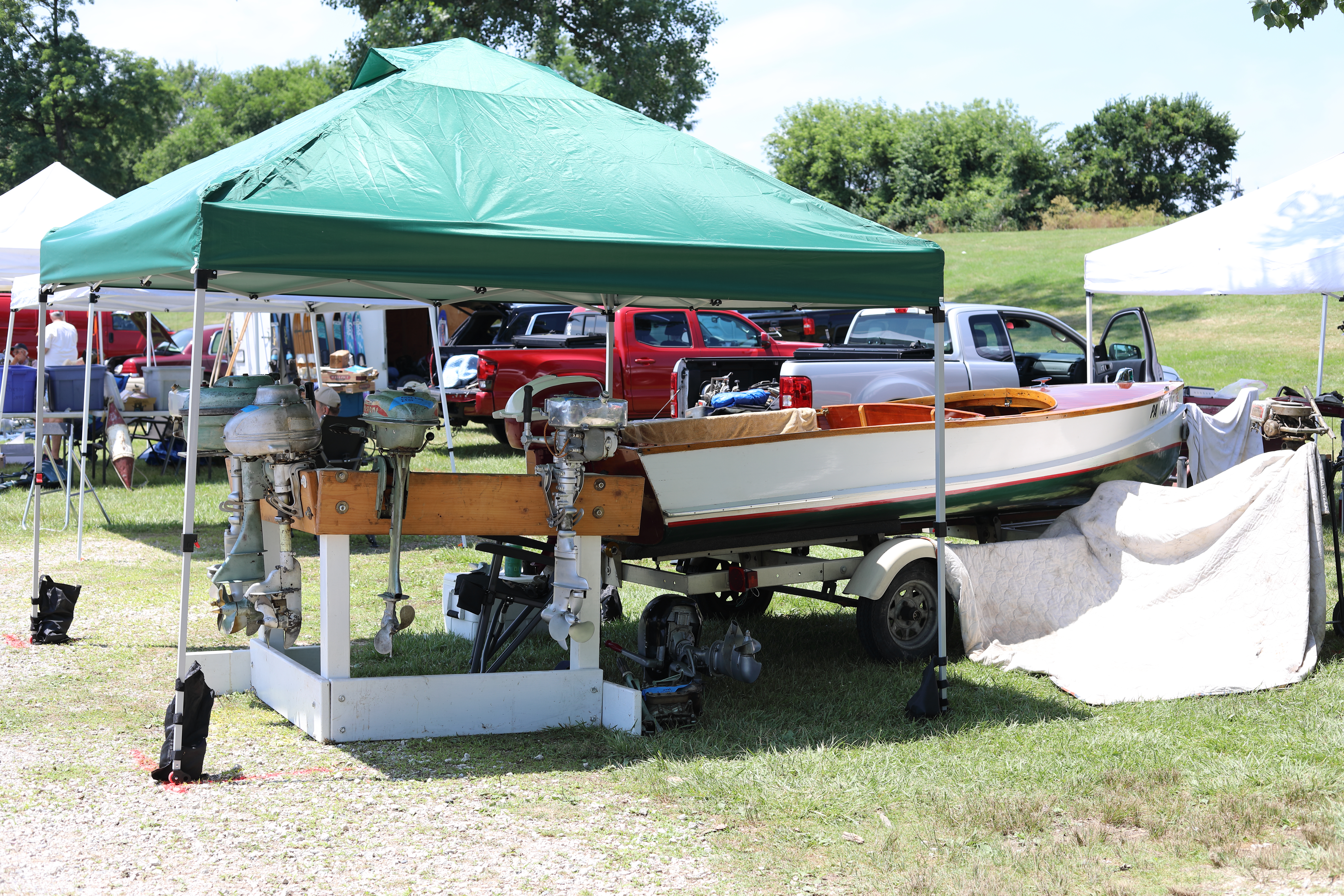 Very warm and sunny on Thursday, with an occasional pleasant breeze - the only day I could attend for these pictures. Good times and great deals on outboards and needed parts were found. Quite a few boats coming in all day with the promise of some great runs! There were many fantastic motor displays under the tent this year, as well as the annual Auction-Under-The-Tree that everyone seems to enjoy. Check the pictures under Motors to view some of these display motors.