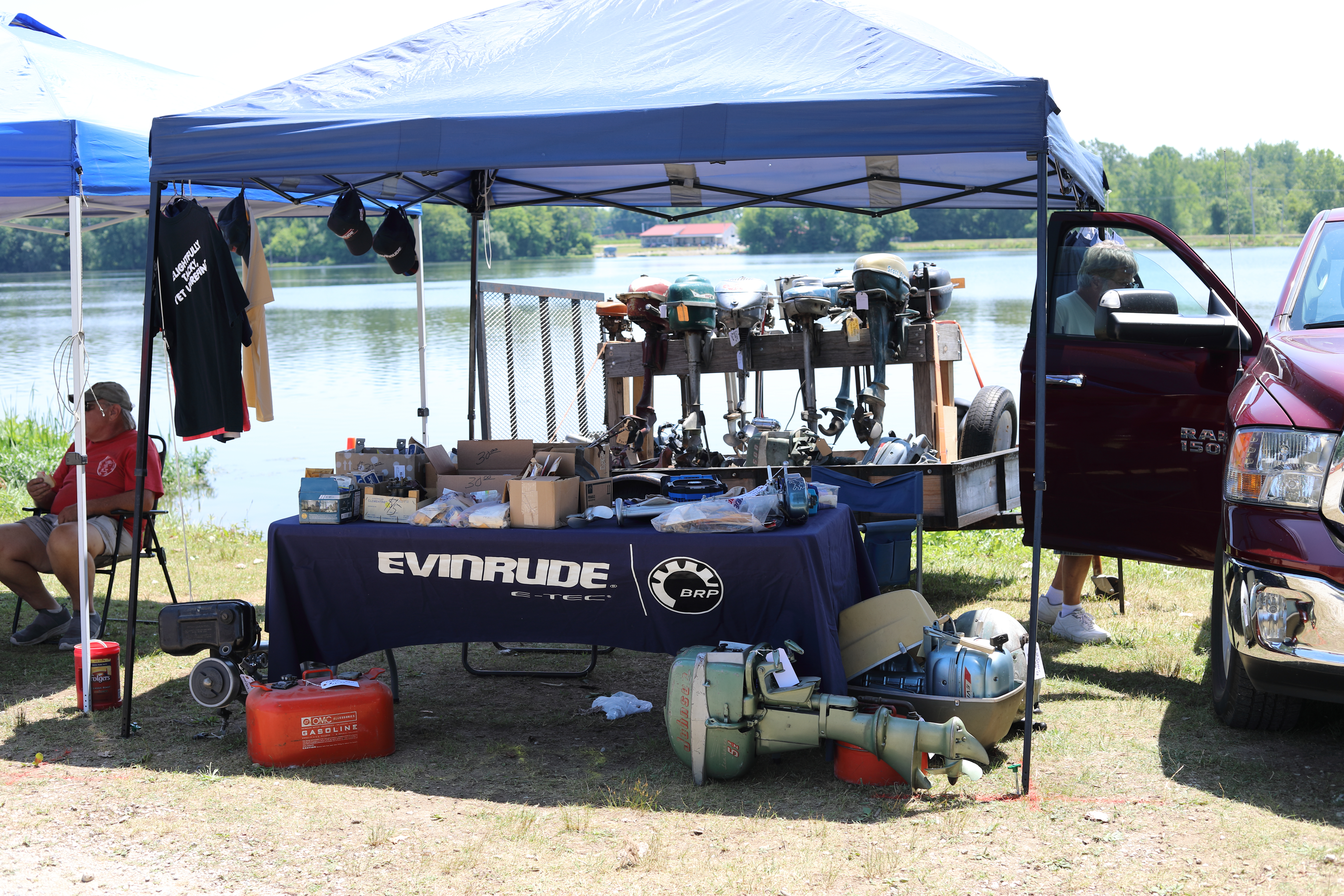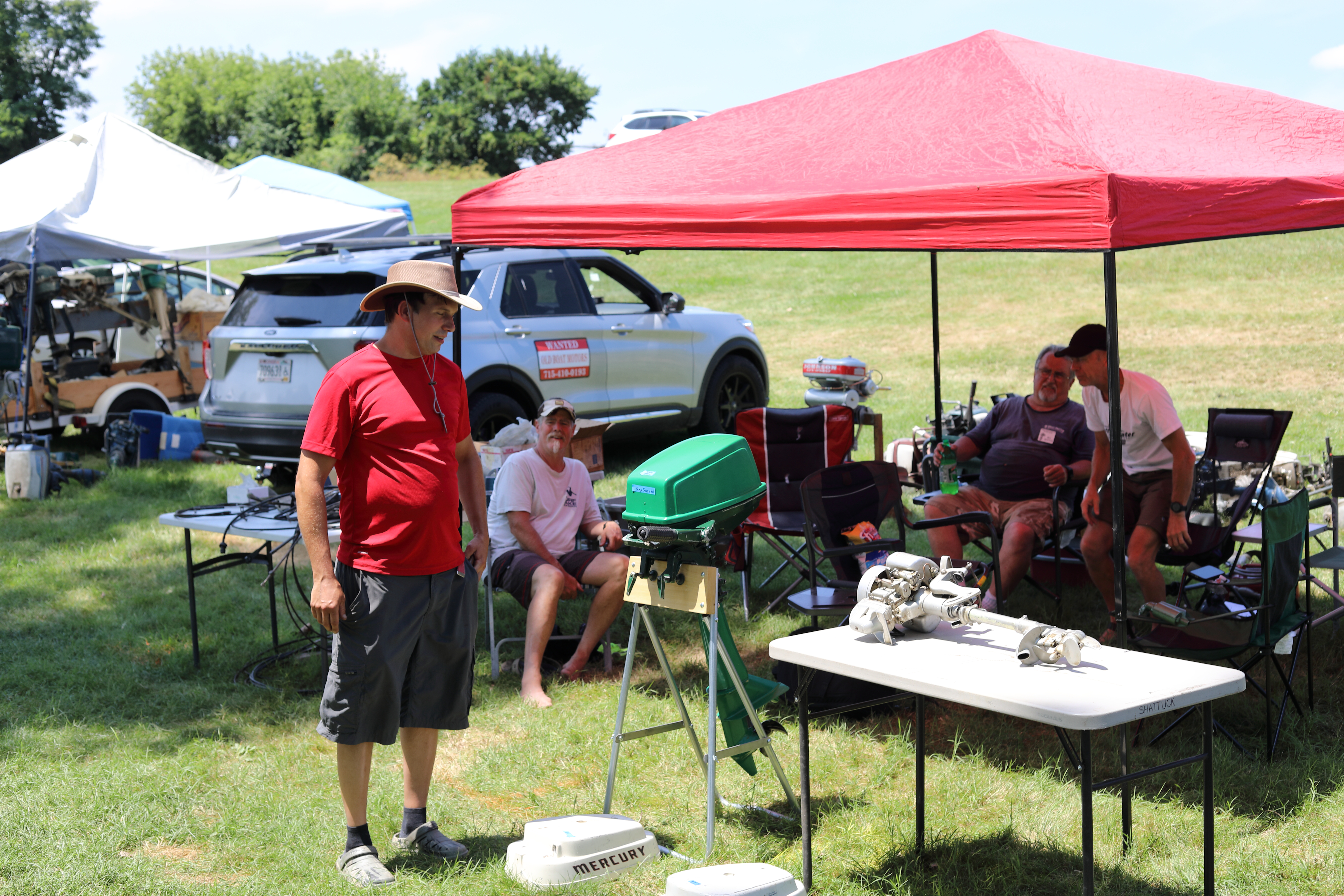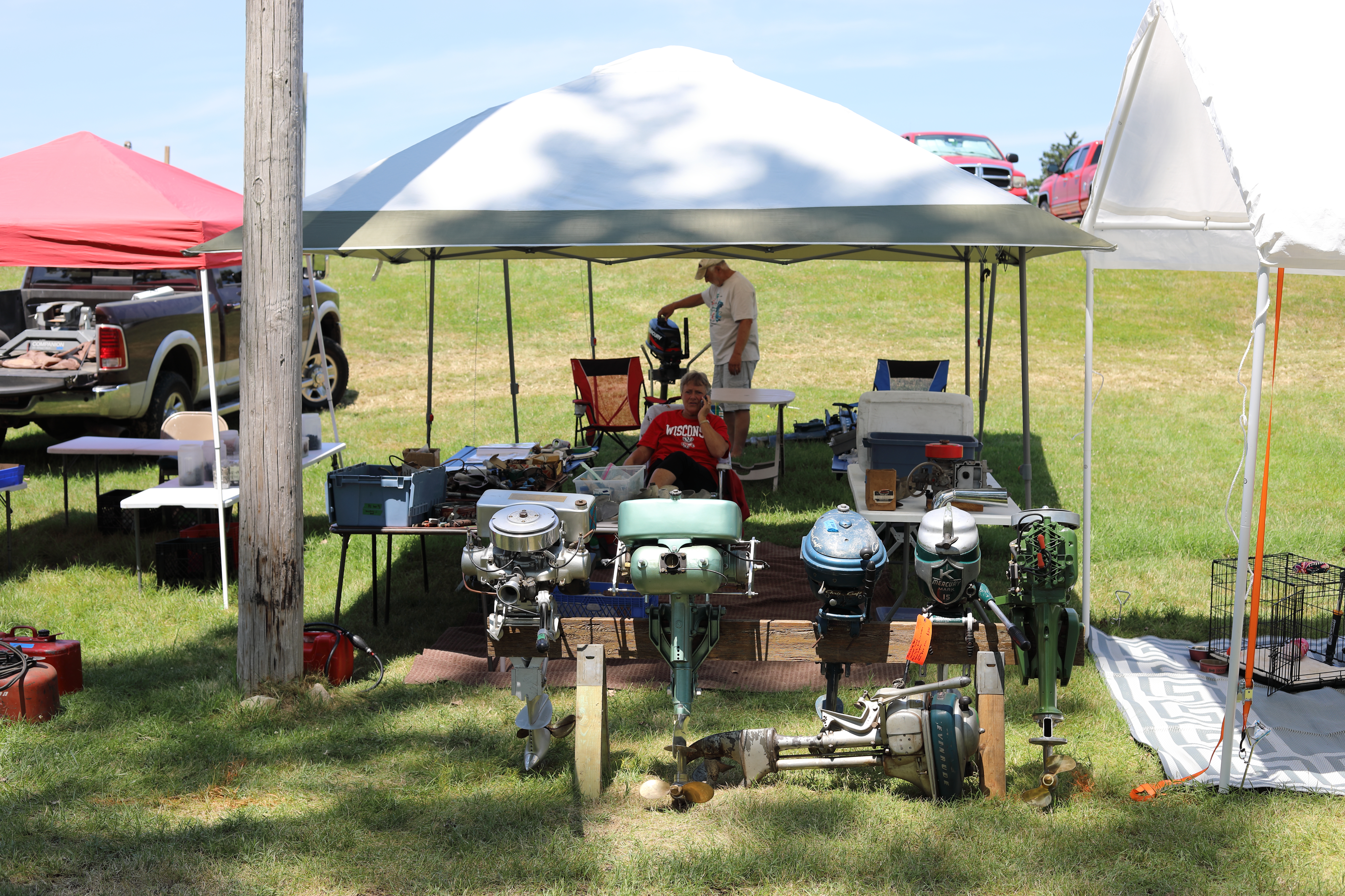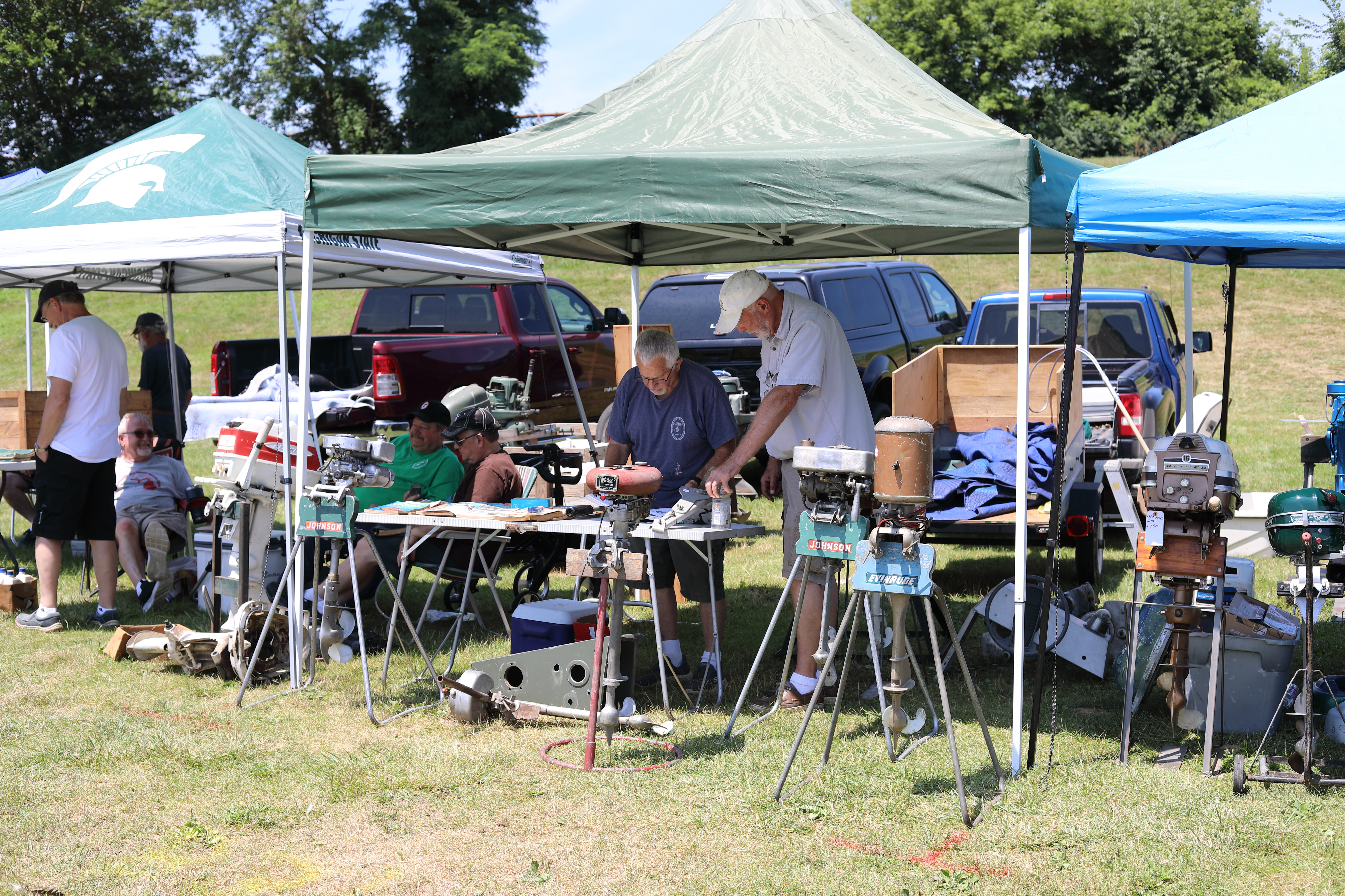 Very warm and sunny on Thursday, with an occasional pleasant breeze - the only day I could attend for these pictures. Good times and great deals on outboards and needed parts were found. Quite a few boats coming in all day with the promise of some great runs! There were many fantastic motor displays under the tent this year, as well as the annual Auction-Under-The-Tree that everyone seems to enjoy. Check the pictures under Motors to view some of these display motors.